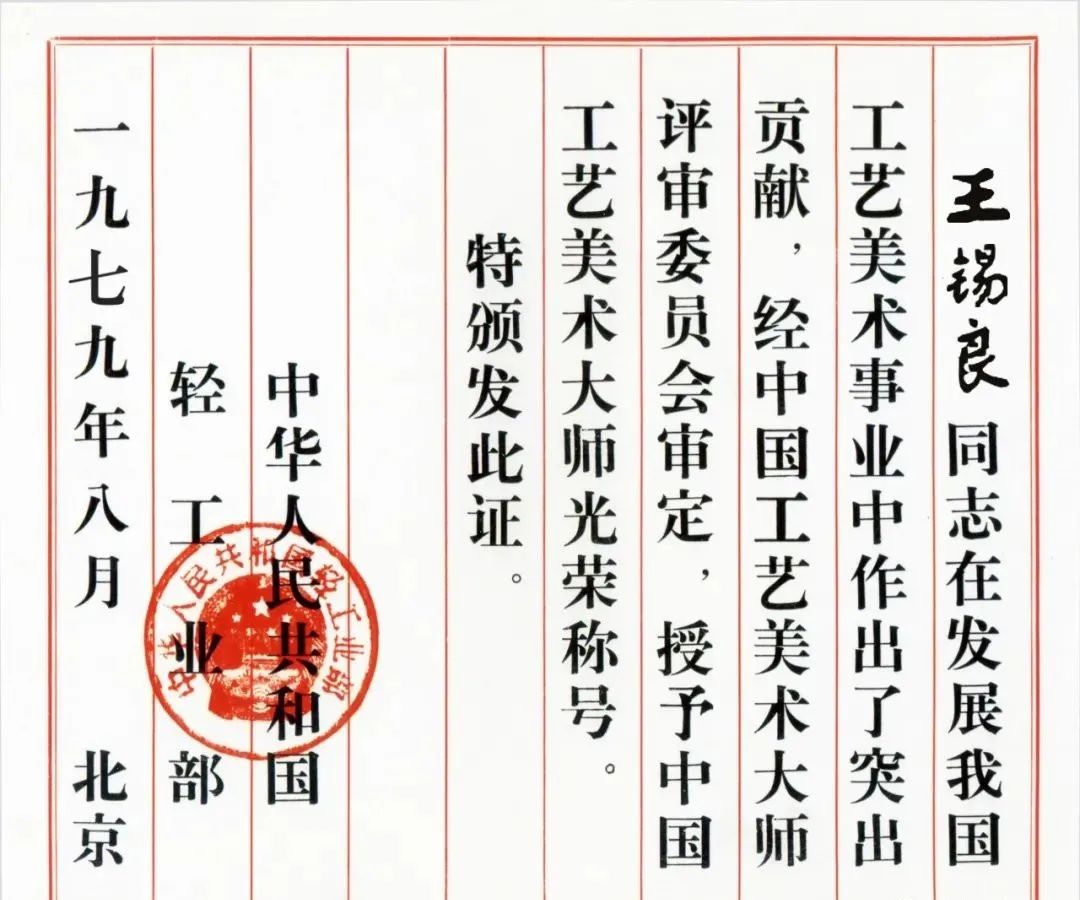 1979年,新中国决定从全国众多的工艺美术大师中评选出杰出代表人物,王锡良从众多陶瓷大家中脱颖而出,被轻工业部授予“中国工艺美术大师”称号!这是新中国陶瓷界首位中国工艺美术大师!这也是景德镇首位获此殊荣者。