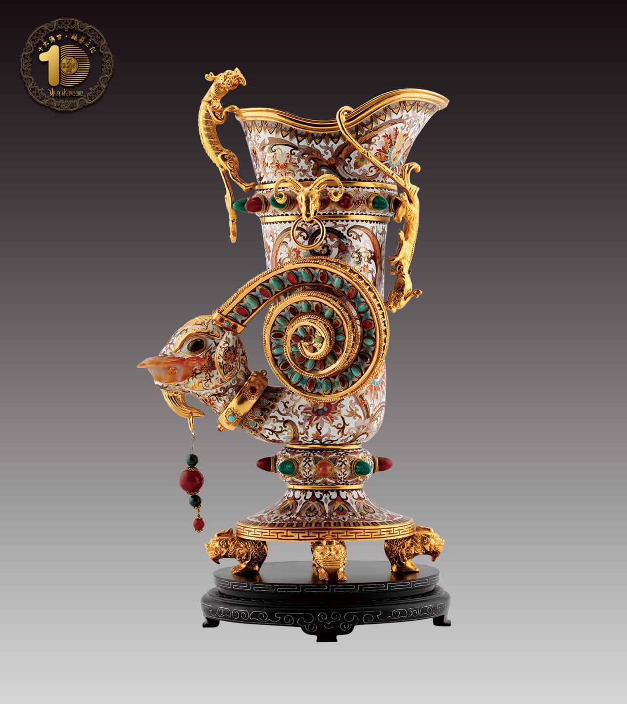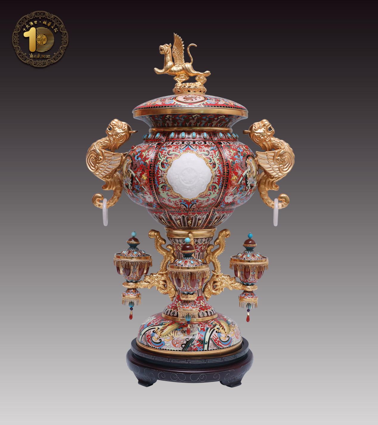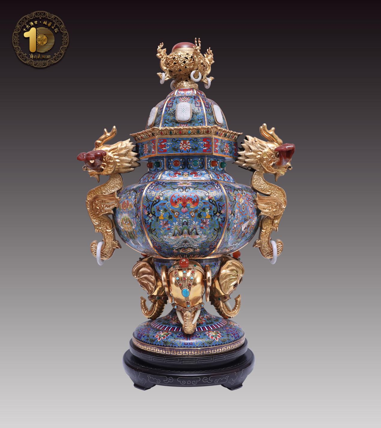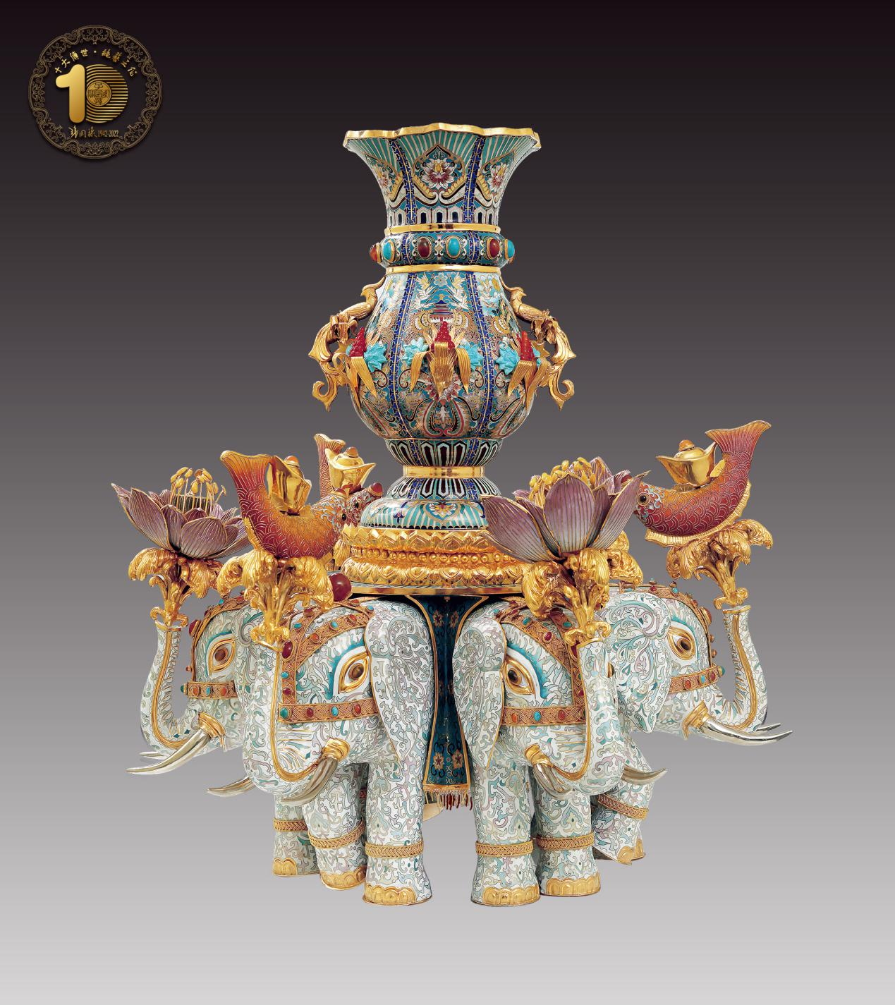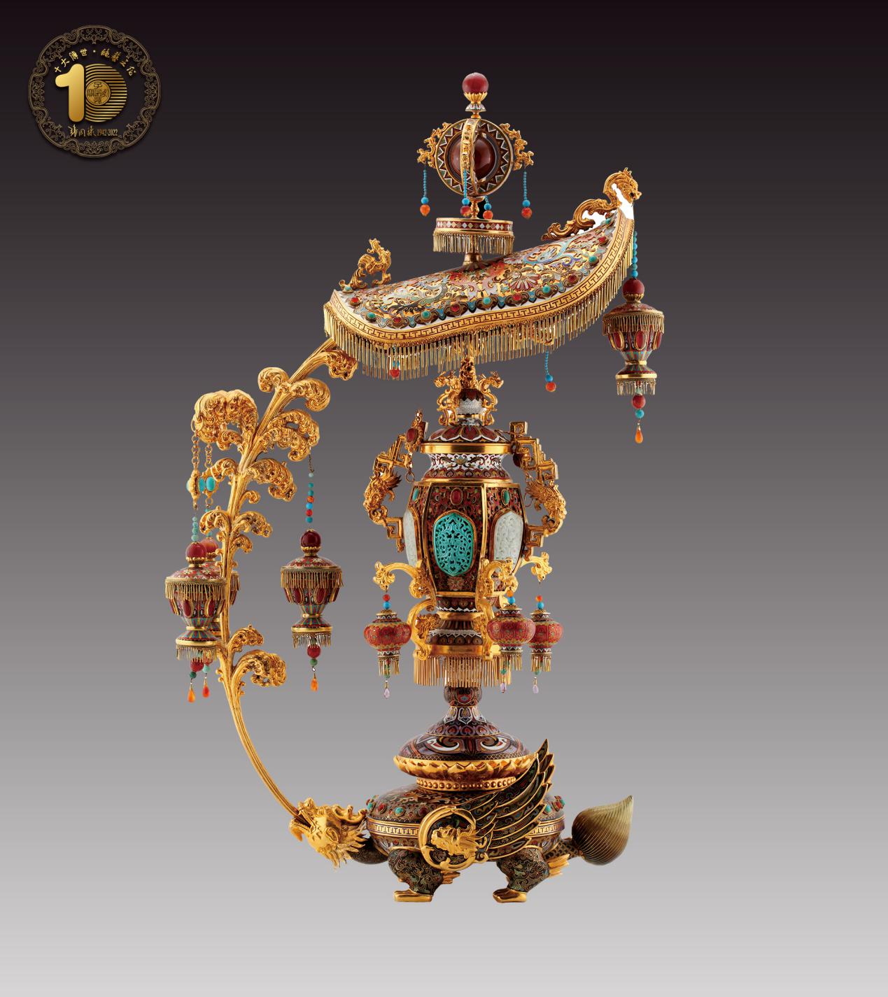 现场展出四十余件中国工艺美术大师张同禄的经典作品,其中最受人瞩目的是《十大传世》绝艺之作。张同禄工作室自2020年开始搜集、整理张同禄大师的作品,2023年通过收藏爱好者推选、大众投票等多种方式选出了十件最受大众喜爱的作品,分别是《华冠万年灯》《盛世六和如意炉》《太平有象》《羊角杯》《龙腾虎跃》《喜事临门》《宫灯葫芦》《孔雀壶》,这十件作品被誉为《十大传世》绝艺之作。