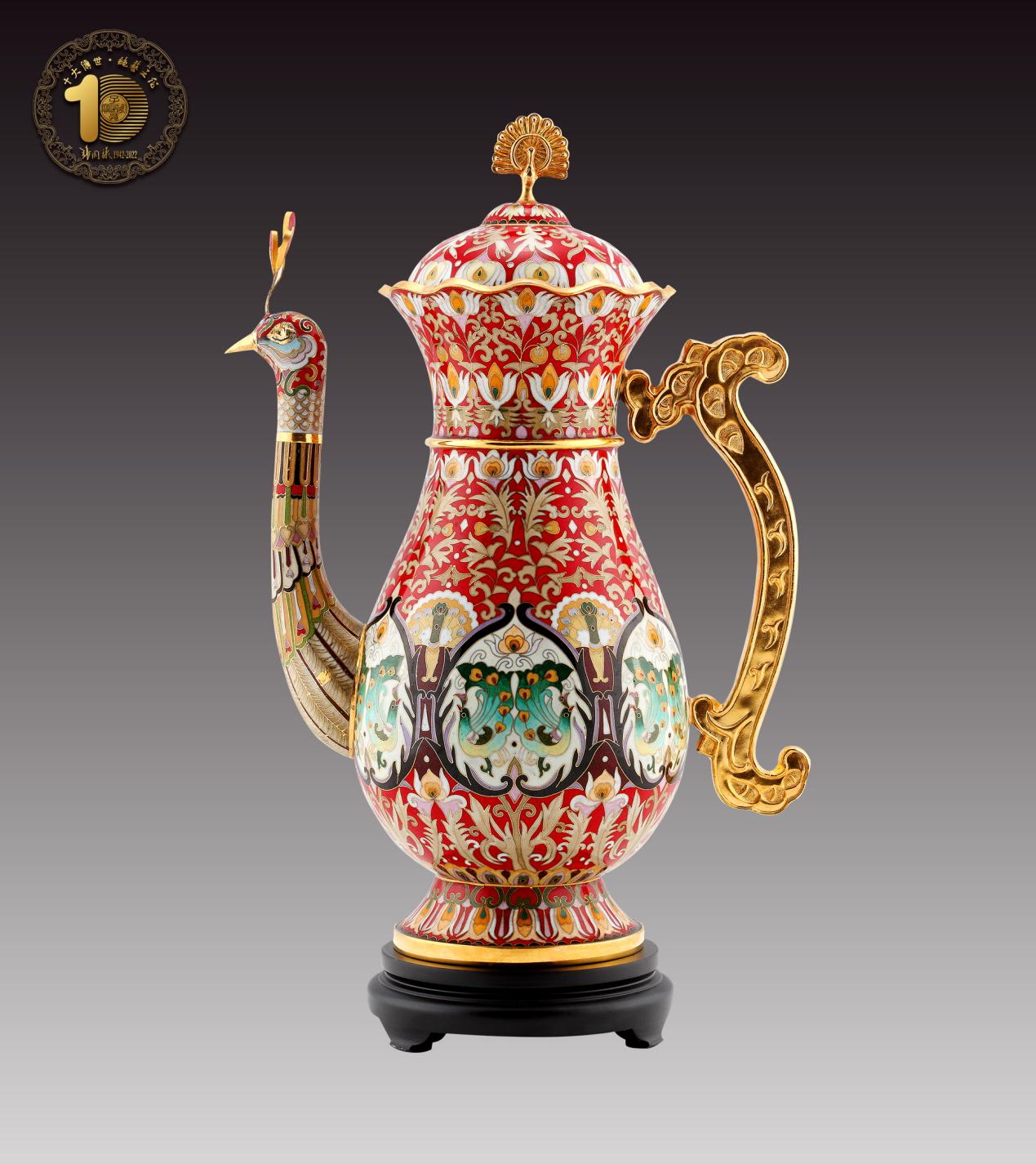 《孔雀壶》是张同禄大师早期成名作,也是大师第一件中国红作品,奠定了张同禄大师在艺术界的地位与高度,《孔雀壶》的造型打破了传统造型的特点,以最新立意孔雀为造型,将孔雀的吉祥、富贵、美丽、忠贞的品性融于一身,歌颂祖国太平盛世,传递人世间的真善美,是中国和平第一壶。