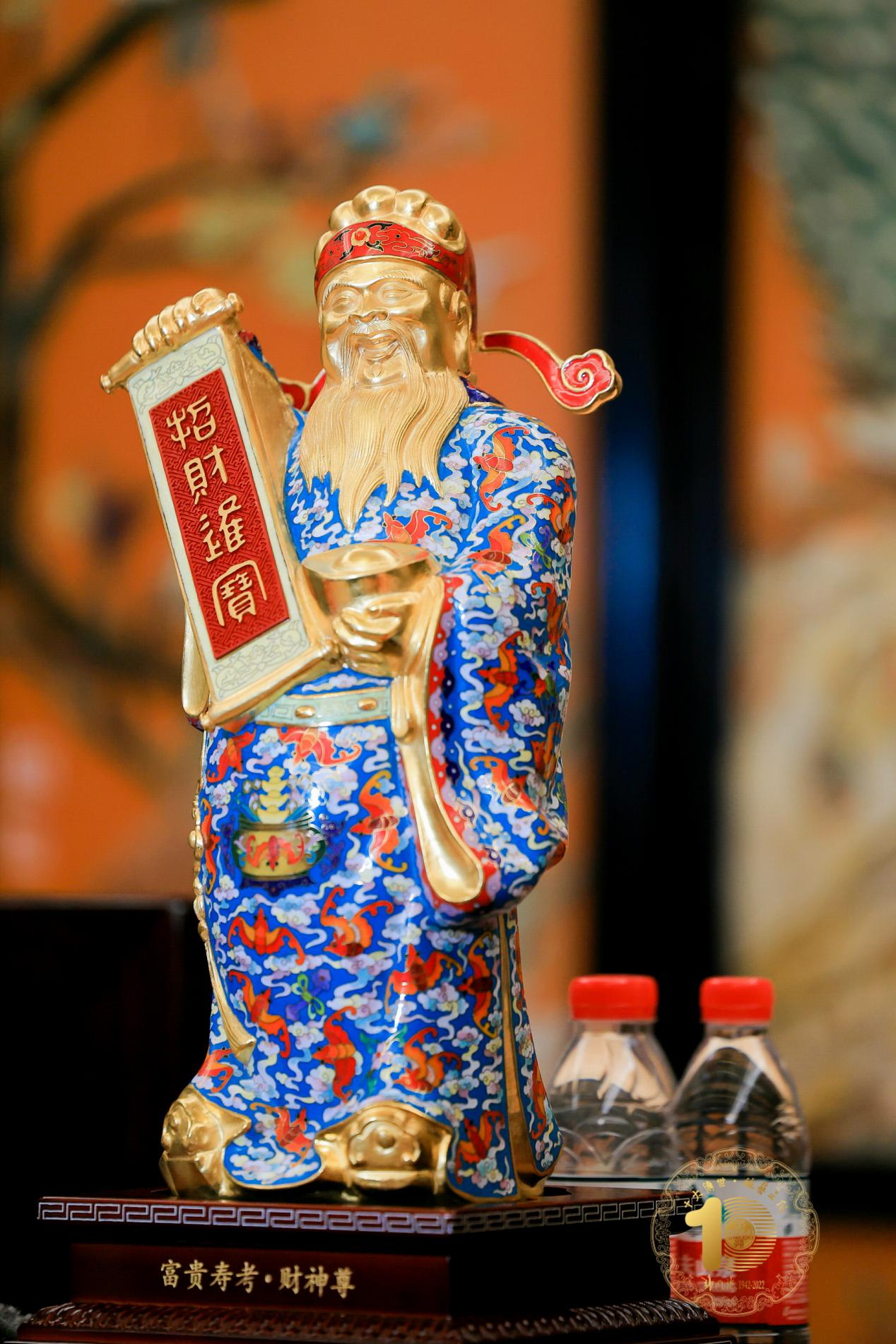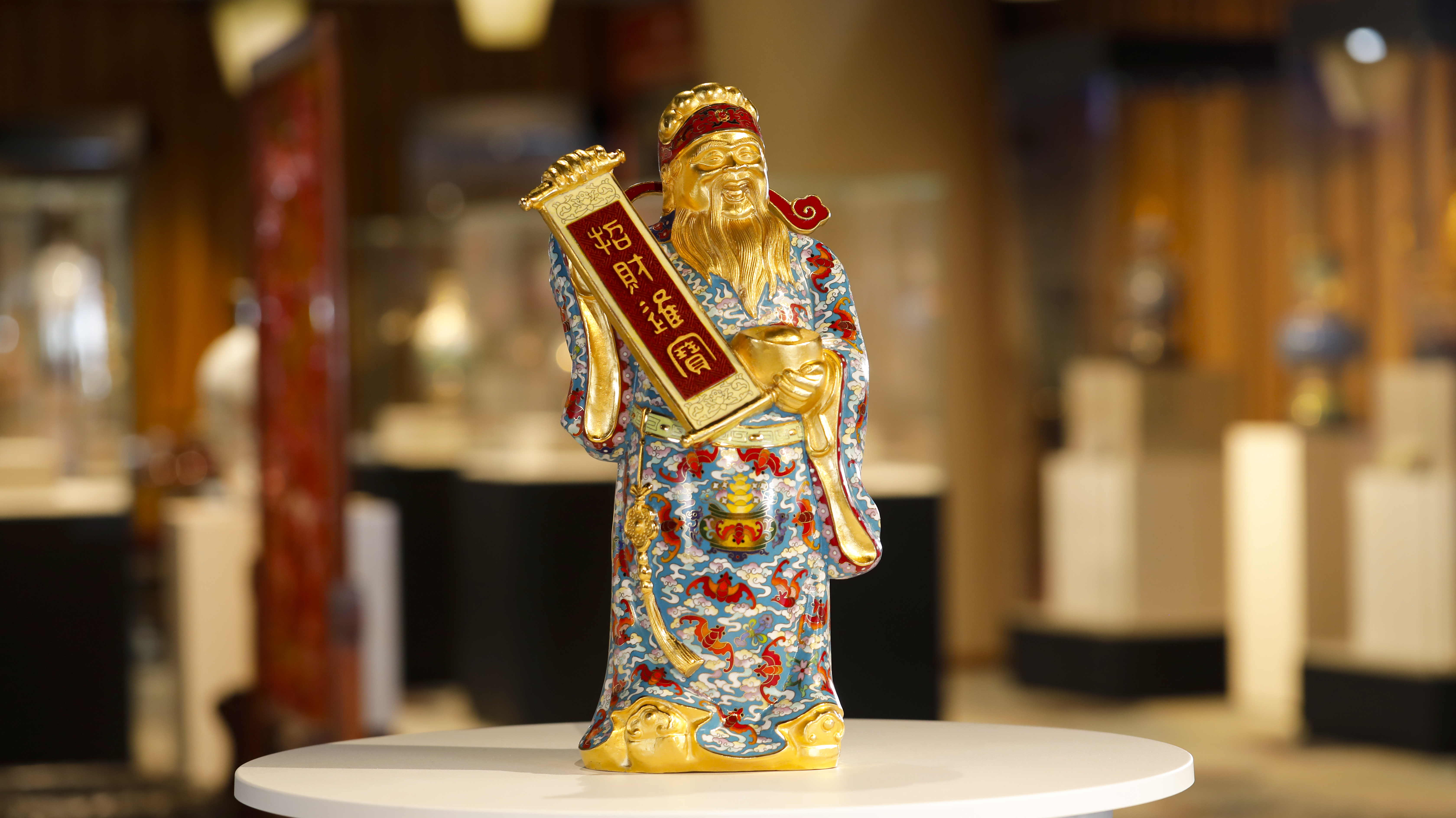 《富贵寿考》财神尊,是北京市工艺美术大师张旭、北京市工艺美术大师杨之新联袂设计创作的,创新性地将景泰蓝和雕漆两项工艺跨界融合,以两大非遗技艺展现我国前年文化的传统魅力。
