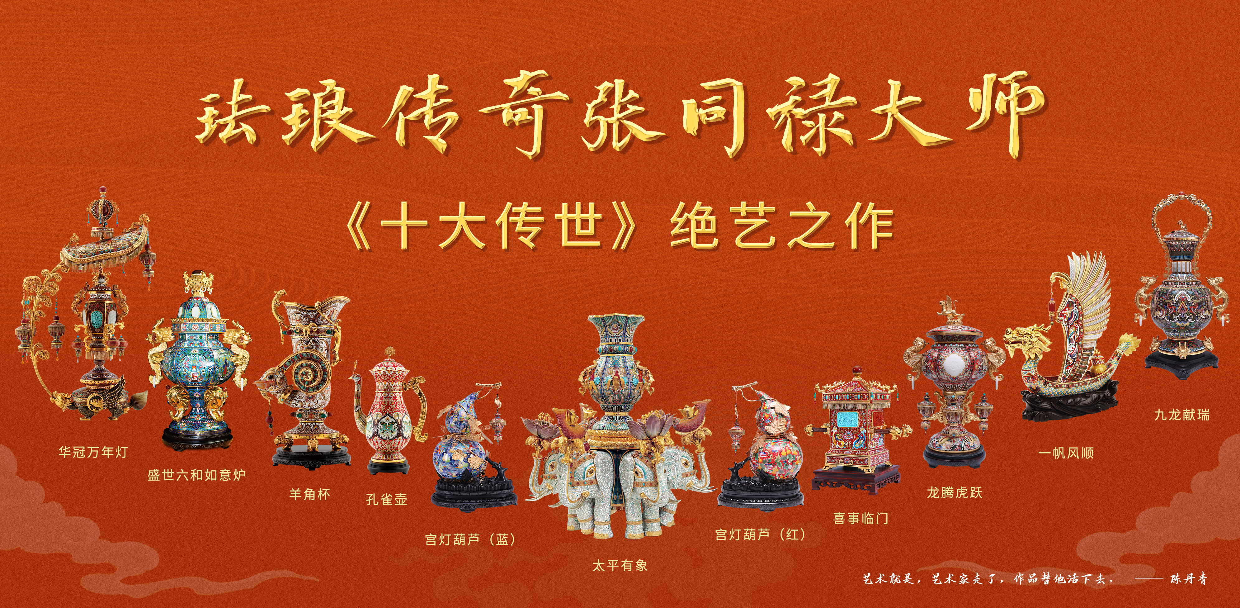 “十大传世绝艺之作”、“张同禄签名及印章”、“1942-2022”,张同禄大师生于1942年,于2022年逝世,享年80岁,为中国工艺美术、景泰蓝艺术事业作出巨大贡献,他的艺术精神和艺术精粹让后世永远铭记,这十件作品出自张同禄大师一生中最具代表性,最具传承的传世绝艺之作。