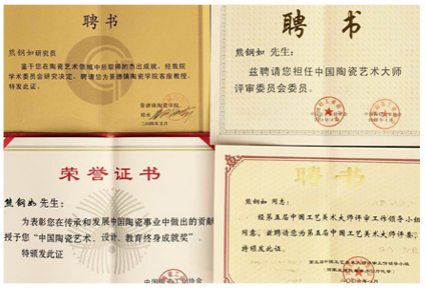 荣获国家级非遗项目景德镇手工制瓷技艺代表性传承人、中国工艺美术大师荣誉称号、国务院特殊津贴证书,三大国家级荣誉一举囊括!