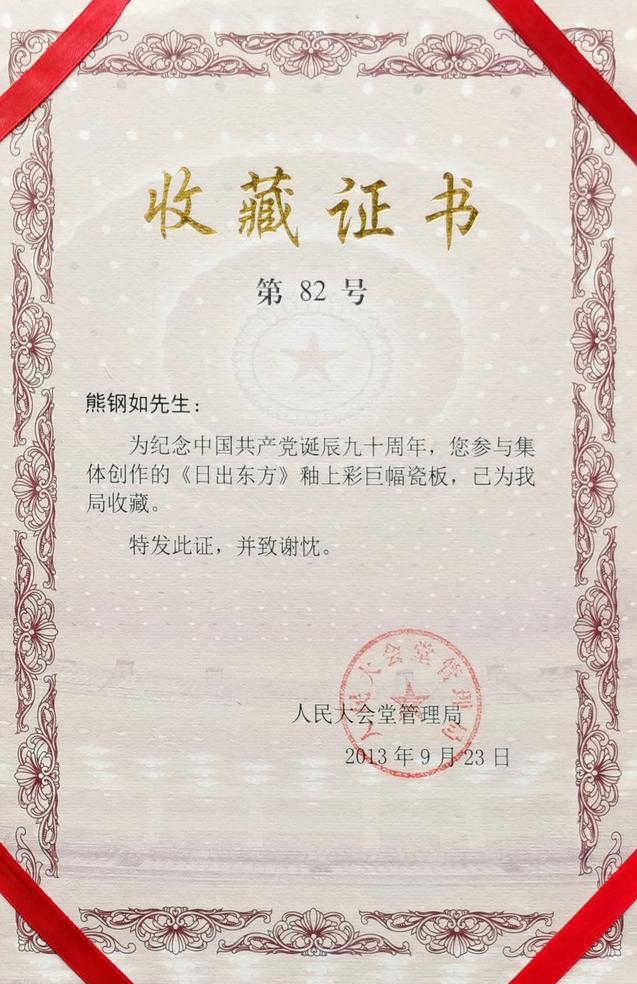 1999年、2013年,熊钢如大师陶瓷作品两次被人民大会堂收藏。