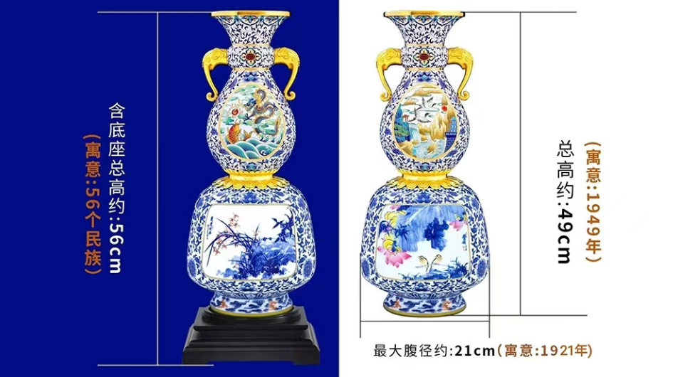 《基业长青》传承尊高49cm,寓祖国伟大生辰1949;最大直径21cm,寓党的伟大起点1921;总体高56cm,寓56个民族团结一心。