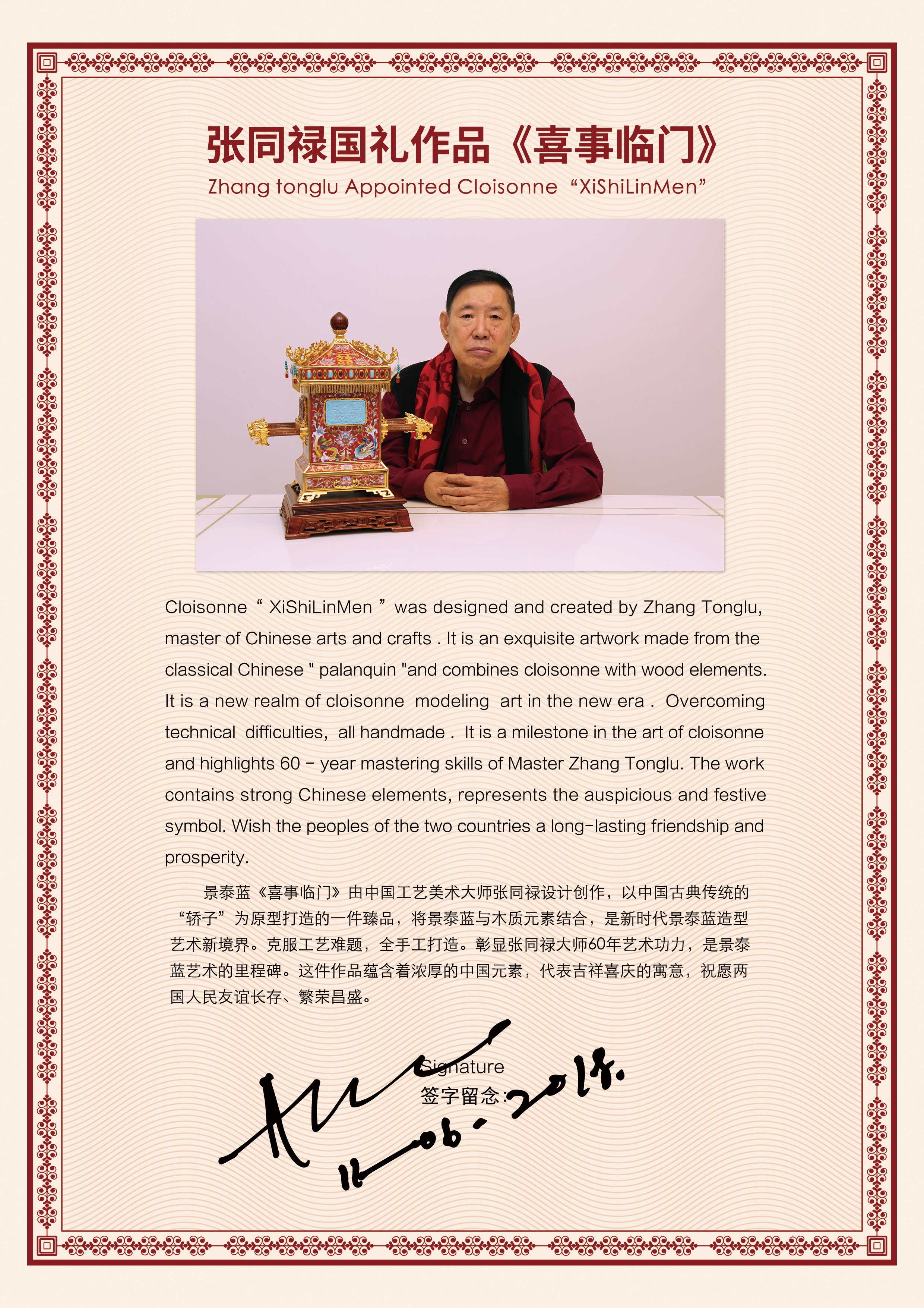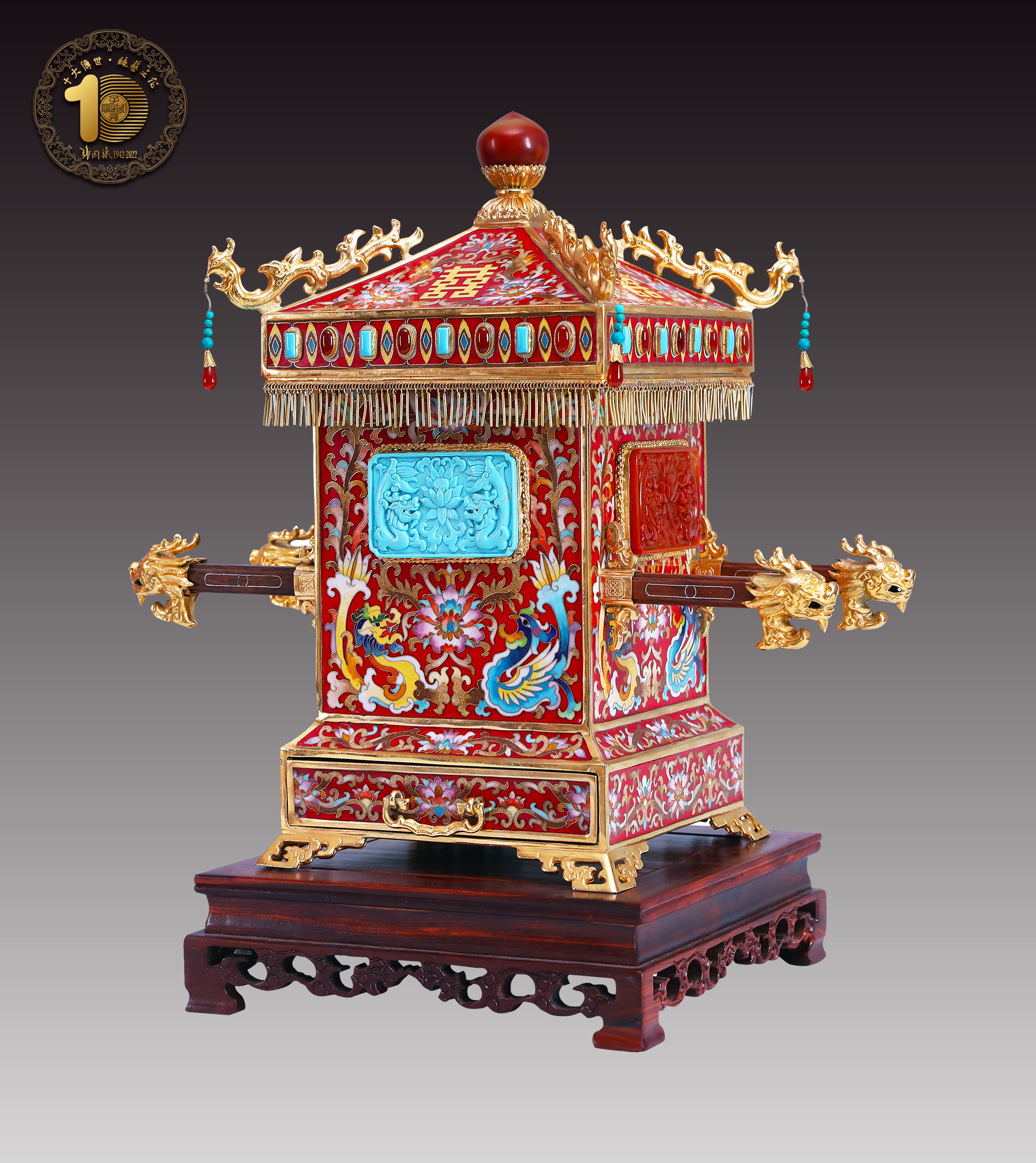 《喜事临门》轿顶一颗红玛瑶,象征顶戴花翎,寓意鸿运当头,官运亨通。四只整金凤凰,象征非凡地位,寓意鸾飞凤舞、天下太平。整金龙头,象征龙行天下,寓意四方来财,家业兴旺。轿杆长11厘米,银丝点缀,寓意一生一世,一心一意。宝相花环绕其间,争相盛开,雍容华贵,寓意福寿绵长。宝盒相伴,象征聚财纳福,寓意财源广进,好运常驻。“一件景泰蓝,十箱官窑器”,作品集美术、玉雕、镶嵌、整刻、镀金等多工艺结合为一体,为世人呈现出一种辉煌胜金,温润胜玉,光泽胜珠,细腻胜瓷的绝妙艺术效果,是张同禄大师从艺60周年之匠心巨制。