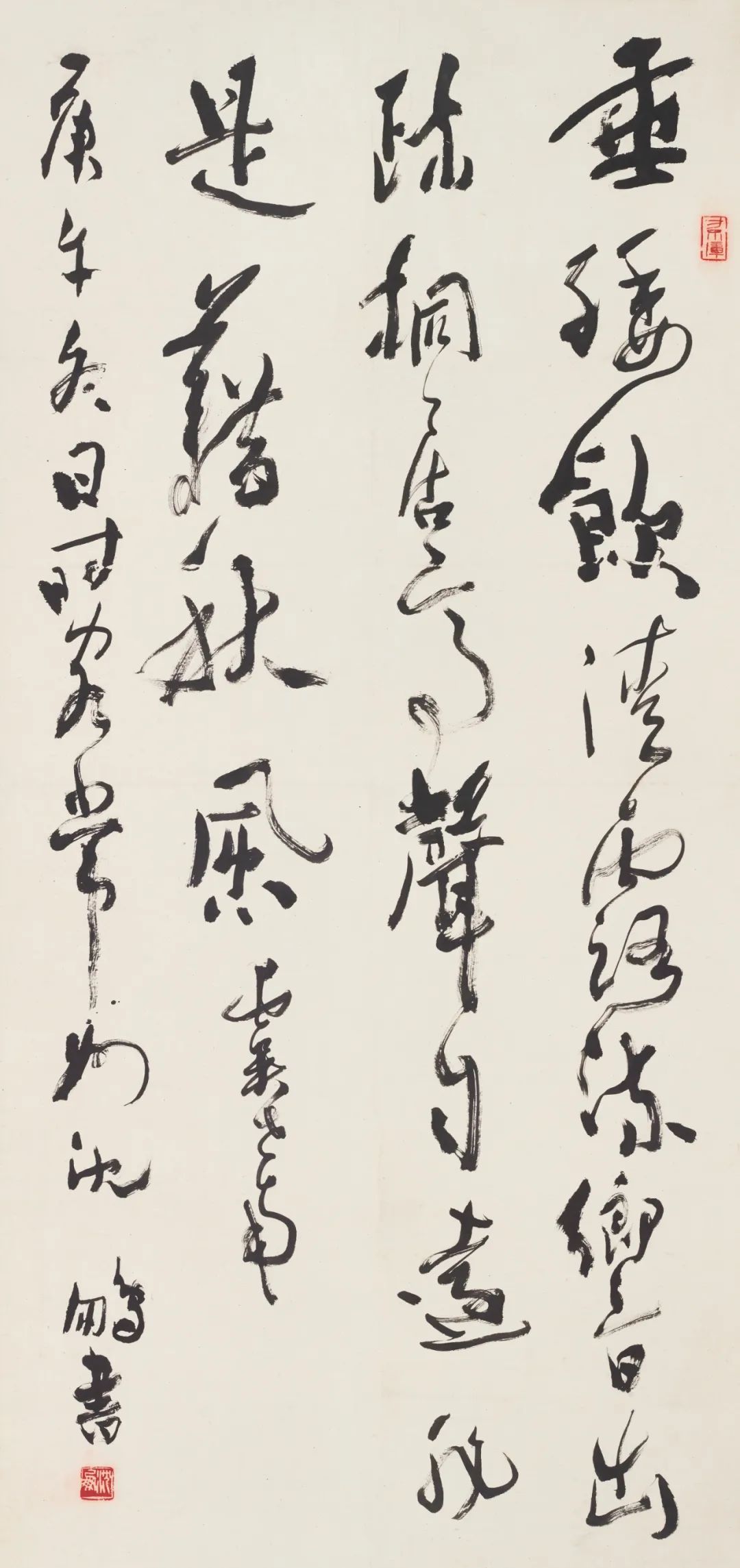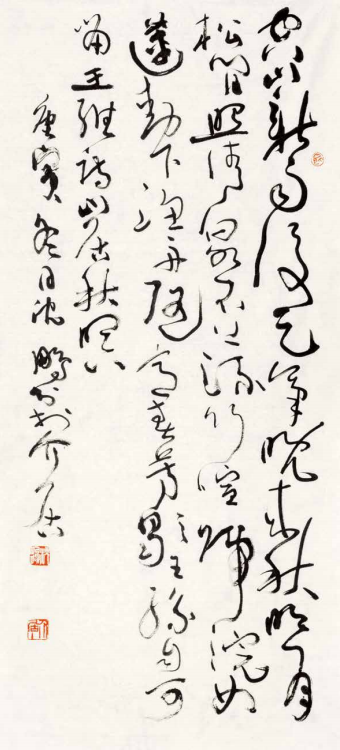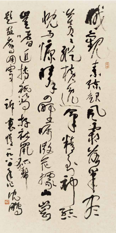 中国书法之所以称为艺术,是因为中国人用书写来表达人的思想感情。所以,中国书法历来讲“书为心画”,沈鹏亦如此。他在书写时,大多是一气呵成,一泄千里,章法与情感的碰撞在这一刻喷薄而出,当手中的笔停下时,他的情感却还久久不散。沈鹏说他在书法创作中最多是自己的体悟,在他长久的凝望中,他已经完全超然物外了。从中人们不难理解,这样一个文弱书生却为何写得一手狂草。沈鹏的行草书和隶书“刚柔相济,摇曳多姿”,以气势恢宏、点划精到、格调高逸、韵味深长而富有现代感,成为当今书坛最具有代表性的书风典型。书法大家启功认为沈鹏“所作行草无一旧窠臼,艺贵创新,先生得之”,赵朴初先生则称赞他“大作不让明贤”。