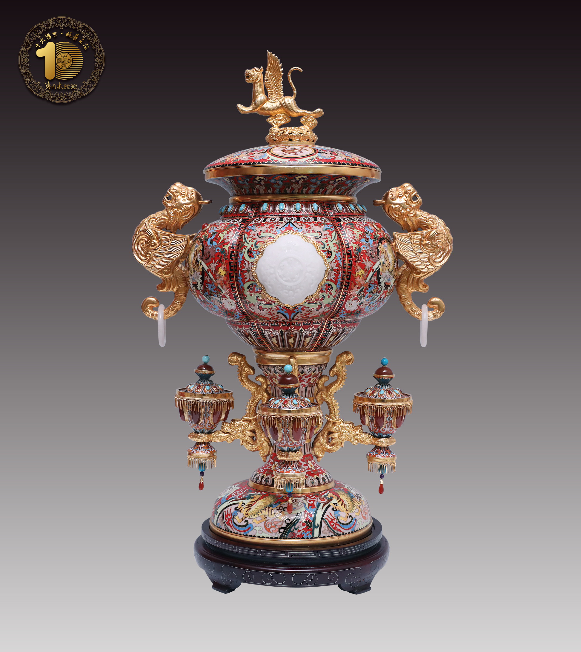 以“中国红”主色调的景泰蓝《龙腾虎跃》,器型庄重,手錾飞虎,镶嵌大规格的镂雕名贵和田玉,整件镶嵌了108颗珍贵天然宝石,华贵璀璨,磅礴辉煌,至尊气势,为罕见景泰蓝艺术品中的上乘之作。堪称中华艺术品瑰宝。