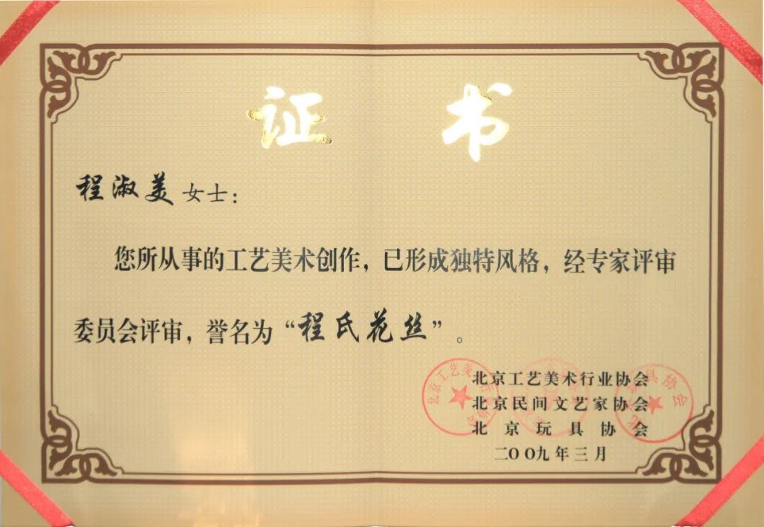 程淑美大师的作品以花丝镶嵌为主,与玉雕等多种工艺、多种材料结合设计理念及处理手法在花丝镶嵌行业中尚属首创,鉴于程淑美大师作品在花丝镶嵌领域独树一帜的艺术风格,北京工艺美术行业协会、北京民间文艺家协会联合组成的专家委员会命名“程氏花丝”。这是北京工艺美术界首批以姓氏命名的艺术流派,用一个人的姓氏誉名一个艺术产业门类可谓莫大的荣誉。