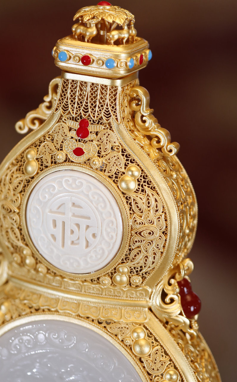 三位大师首次联袂创作,融合花丝、牙雕、玉雕三大非遗技艺,推出首款时代重器——福禄泰瓶。