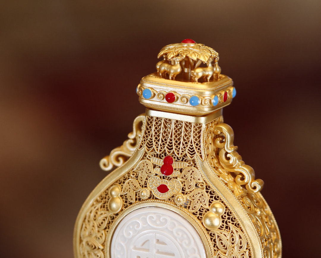 外壁花丝满镂吉祥缠绕纹饰,并创作花丝缠枝荷花、葫芦、芭蕉叶等纹饰,两面镶嵌牙雕,各书浮雕“福”“禄”二字,四周辅以如意纹饰,牙料白润通透,细腻无裂,油润光泽,精工细作,一福一禄两两相对,寓意吉祥如意,福禄双全,五福临门。