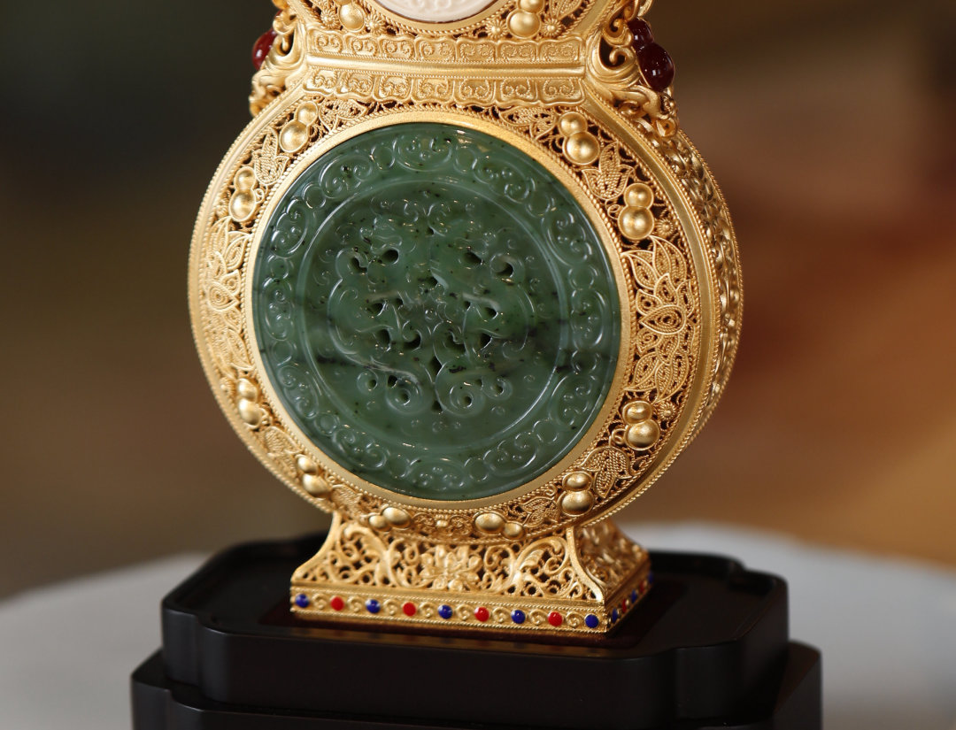 整件作品通高约230毫米,花丝镂空精致,花纹繁复,牙雕白糯流畅,质地细腻,玉璧温润光洁,雕刻细腻入微。气韵雍容华贵,金碧辉煌,大气中正不失流光溢彩,工艺极为精细讲究,堪称当代工艺美术集大成的国宝大作。