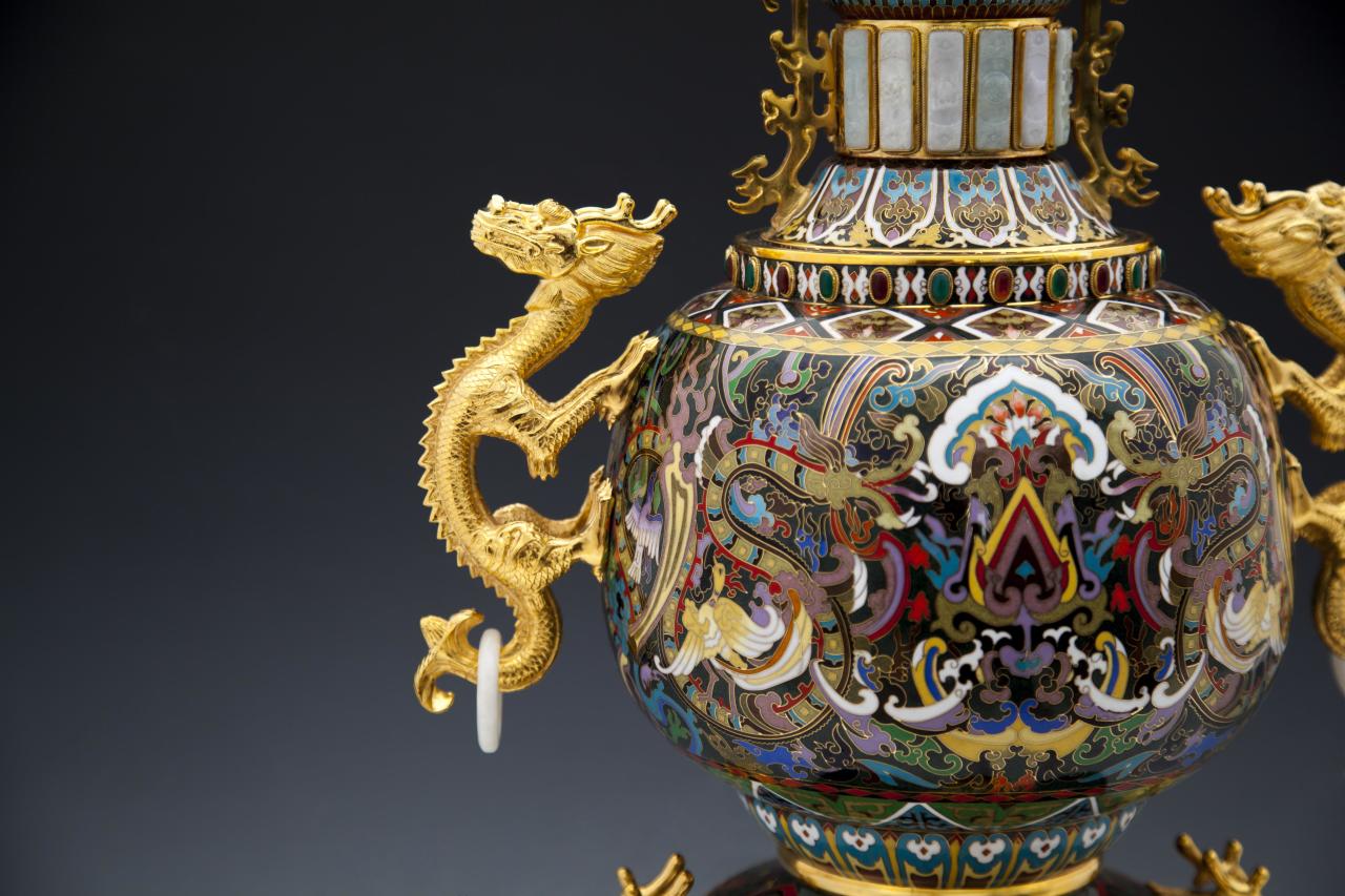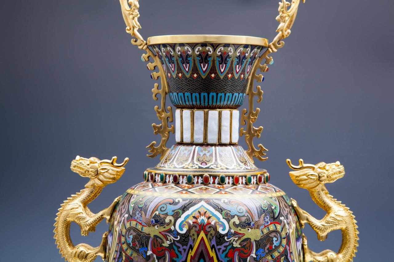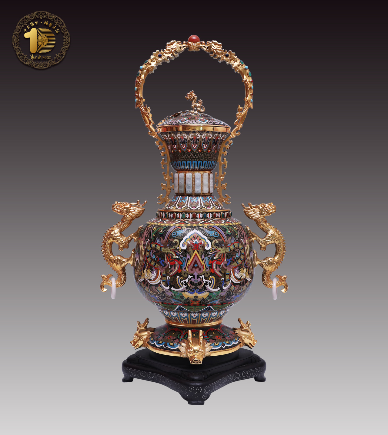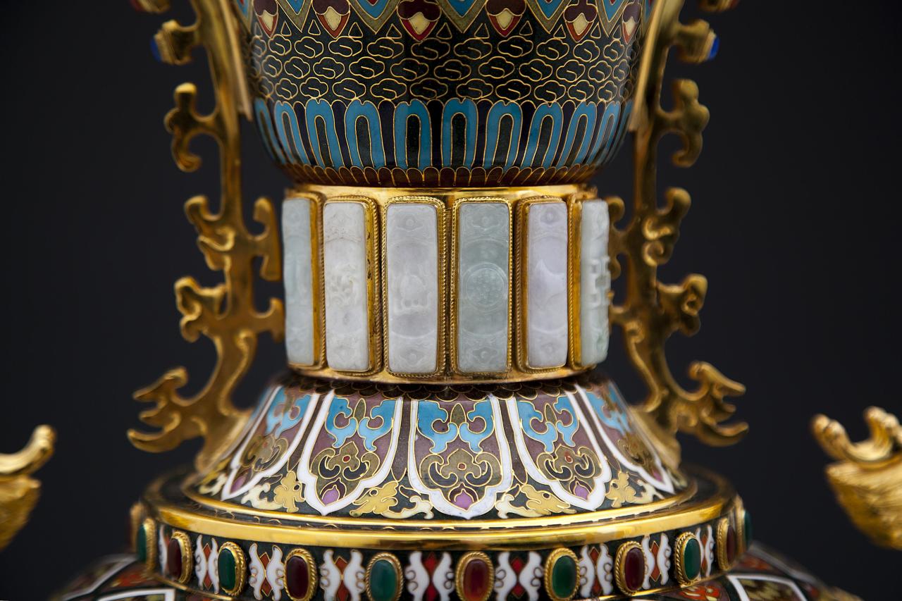 作品融合景泰蓝、玉雕、花丝等多种皇家工艺,镶嵌翡翠、松石、青金等名贵玉石 85 颗 。华美造型、奢华工艺,登顶皇家艺术之巅!超越以往的大成之作!