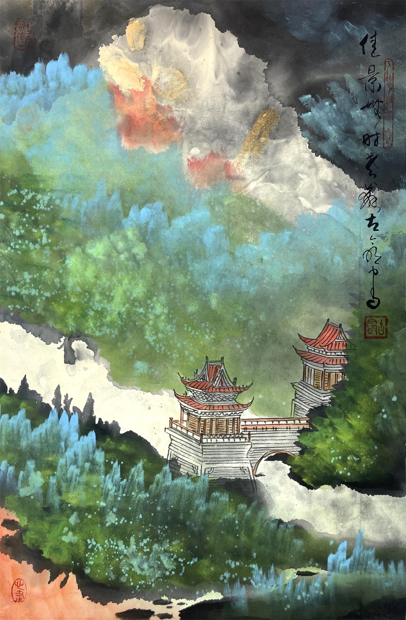 中国传统的楼阁山水,都以青绿和工笔为主,而古今明的楼阁山水,是工笔和没骨写意相结合,形成了色彩斑斓,气势恢宏,磅礴大气的山水。