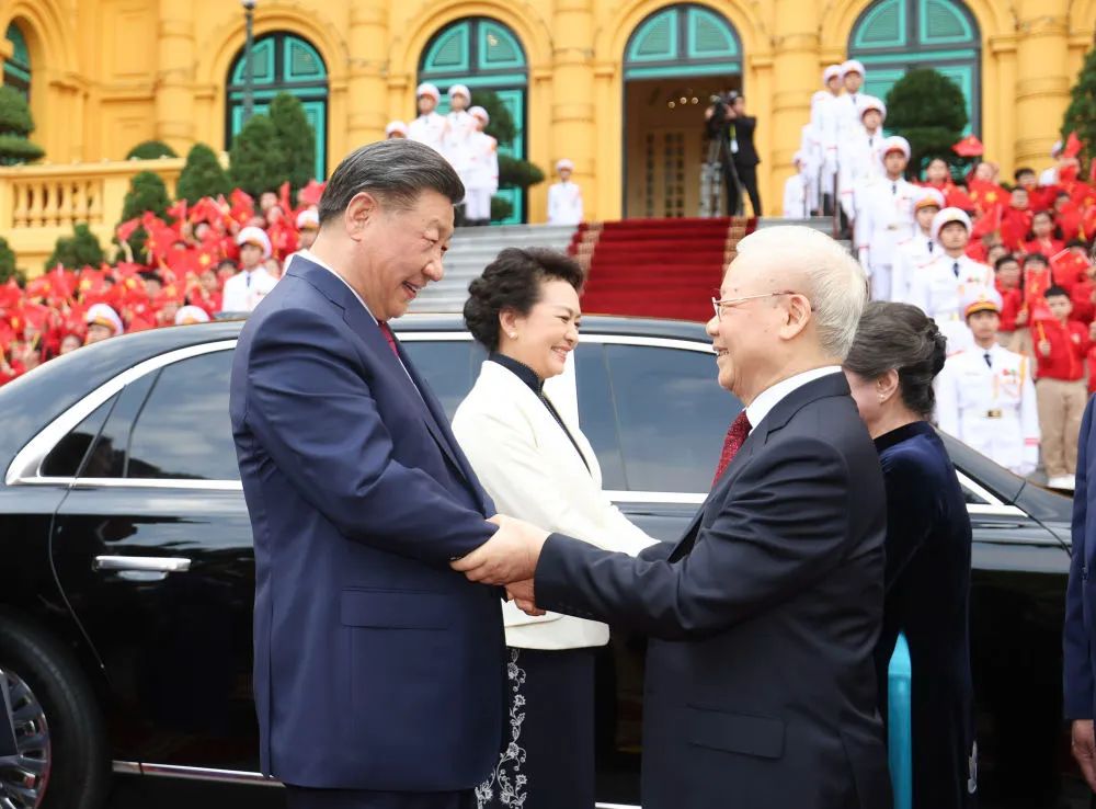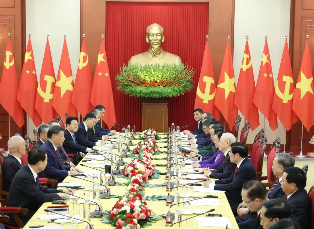 当地时间12月12日下午,刚刚抵达河内的中共中央总书记、国家主席习近平在越共中央驻地同越共中央总书记阮富仲举行会谈。双方宣布中越两党两国关系新定位,在深化中越全面战略合作伙伴关系基础上,携手构建具有战略意义的中越命运共同体。