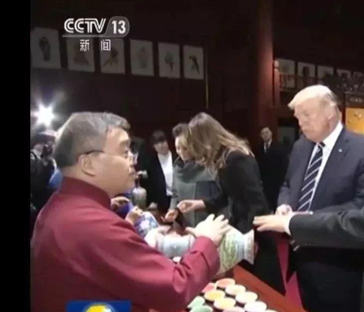 ③ 在2017年11月美国总统特朗普访华期间,钟连盛大师向特朗普夫妇展示了景泰蓝工艺,并现场指导他们进行点蓝。