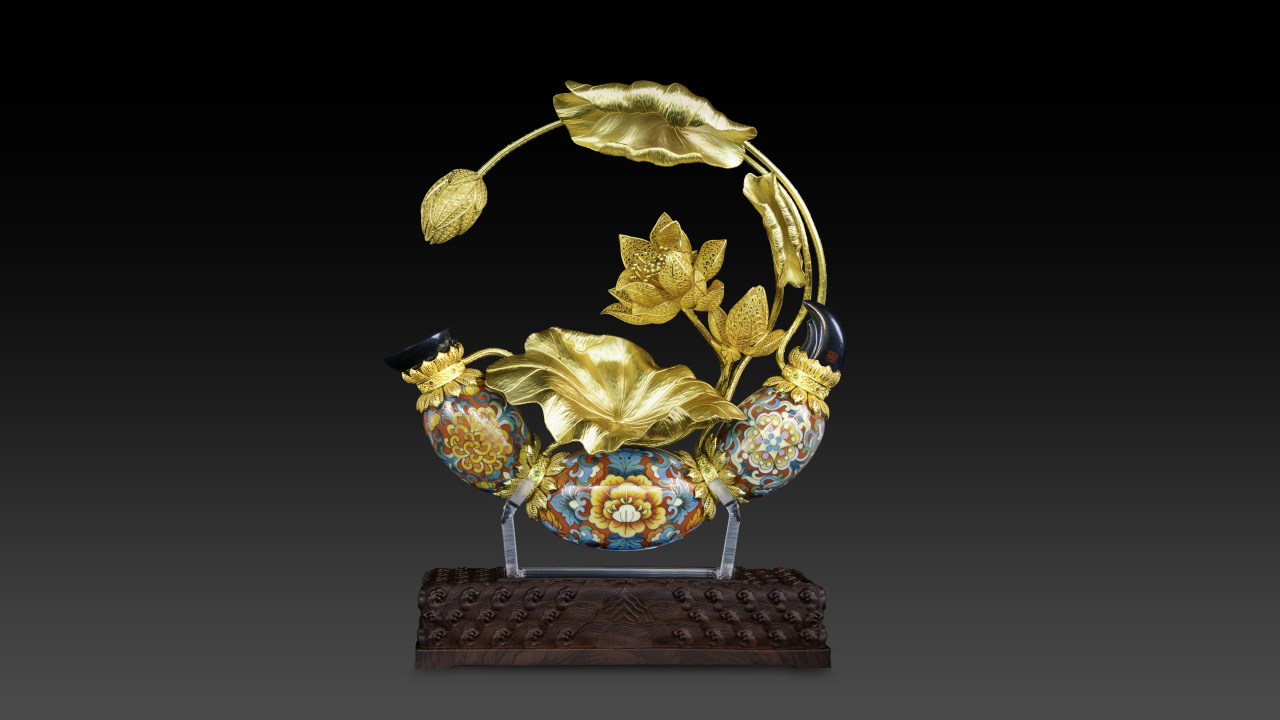 景泰蓝《荷风常盛·中国禧》以中国荷作为核心造型,荷叶细腻精致、栩栩如生,分别展现小荷初露,欲展半开,大叶盛开的生命过程,生动表达了祖国“蓬勃发展·大业常盛”的伟大历程。整体以中国红为主色调,饰以四季花卉图案,以敦煌色彩美学表达,尊贵典雅,寓意“花开四季,禧印中国”。玉雕藕节在如意花丝环的包裹下,温润玉质与精细花丝相得益彰,达到金镶玉的完美融合。