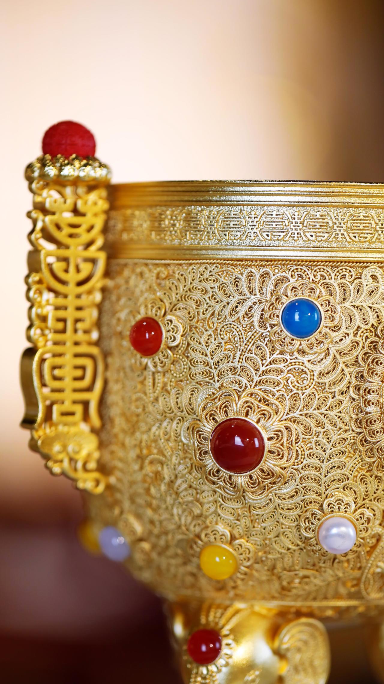 福尊两耳分别为“万寿”“无疆”赞词,寓意祖国山河永固。字间饰以缠枝纹,顶部饰莲花,内嵌玉珠。两颗玉珠,如月之升,如日之恒,如华夏之光,普照神州。
