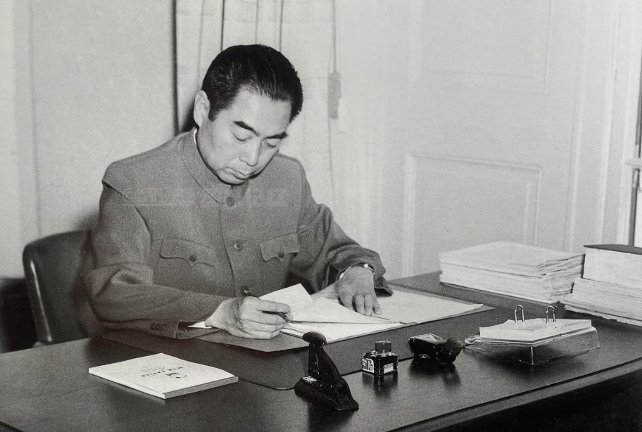 1954年4月至7月,周恩来率领中国政府代表团出席日内瓦会议。图为周总理在代表团住所内办公