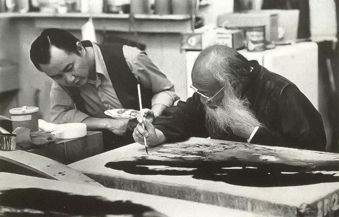 张大千在石版上进行创作,左一为其子张保罗,1973年