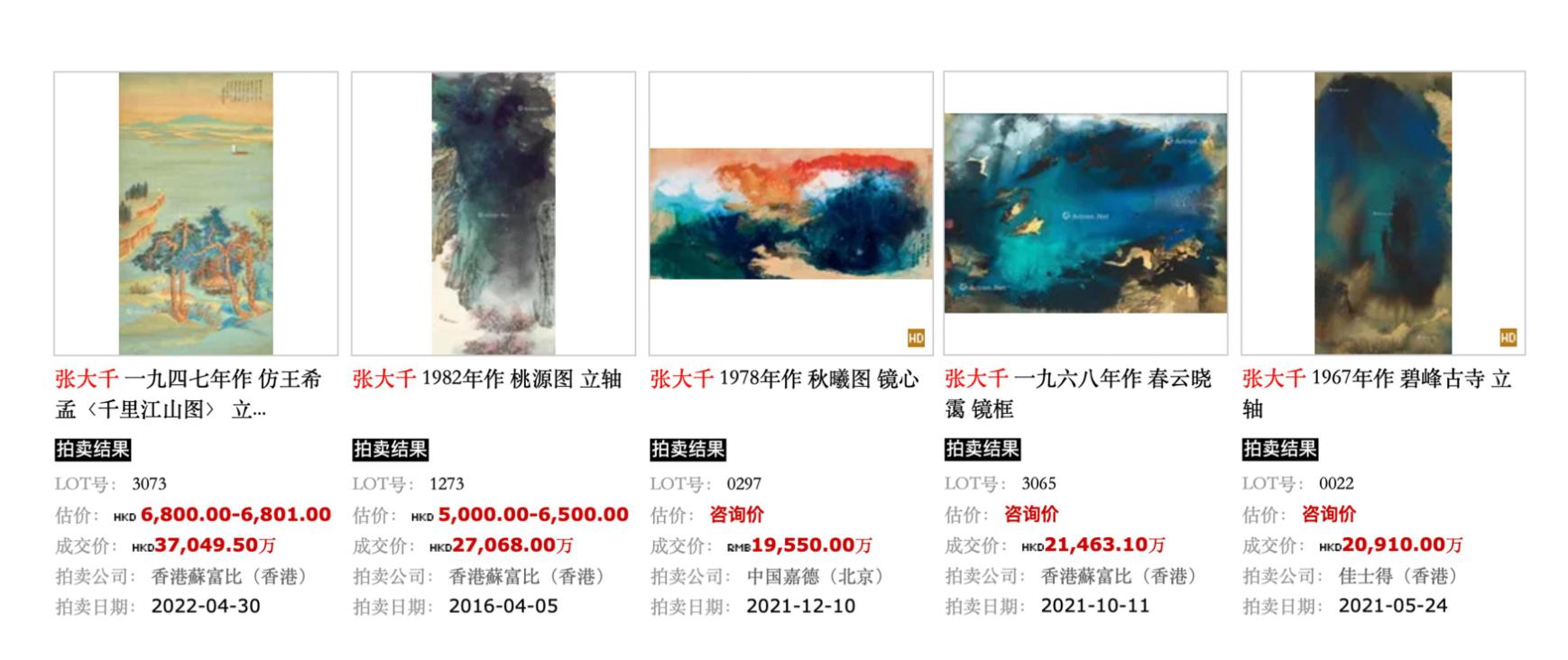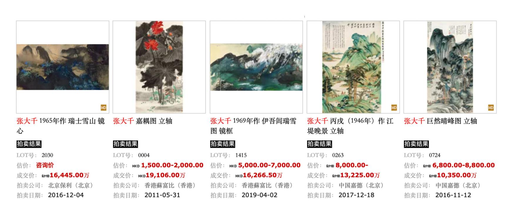 张大千作品一直广受藏家青睐,市场十分活跃。其中十大传世作品,拍卖价格均过亿!