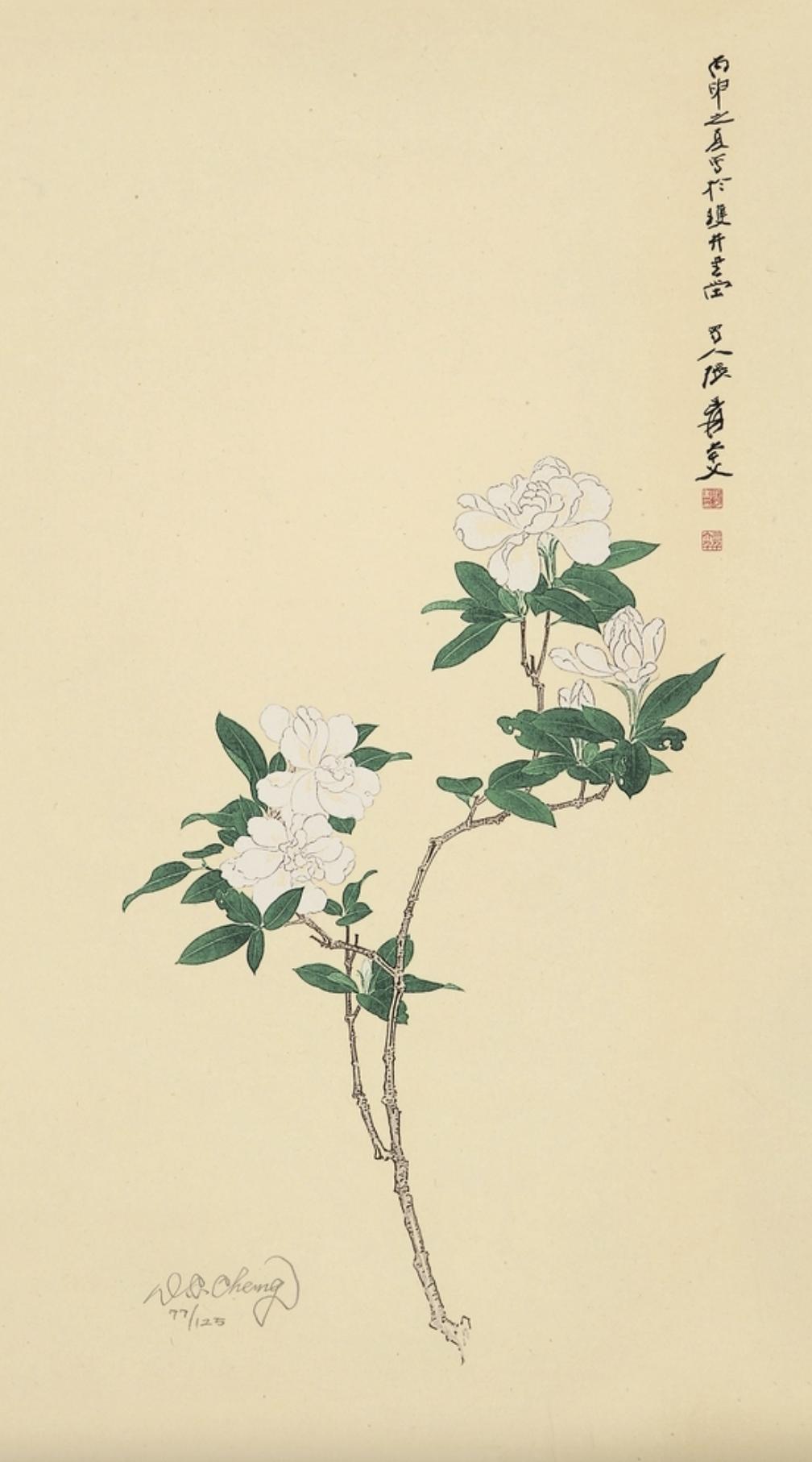 石版画《栀子花开》采用仿宋式的折枝写生技法,枝干和花叶以精细的线条勾勒,每一朵花都栩栩如生,从含苞待放到盛开的花朵,都描绘得如同画谱一般精确。画面精致而不失工整,美丽而不流俗,同时又融入了张大千独特的笔墨韵味和神韵。