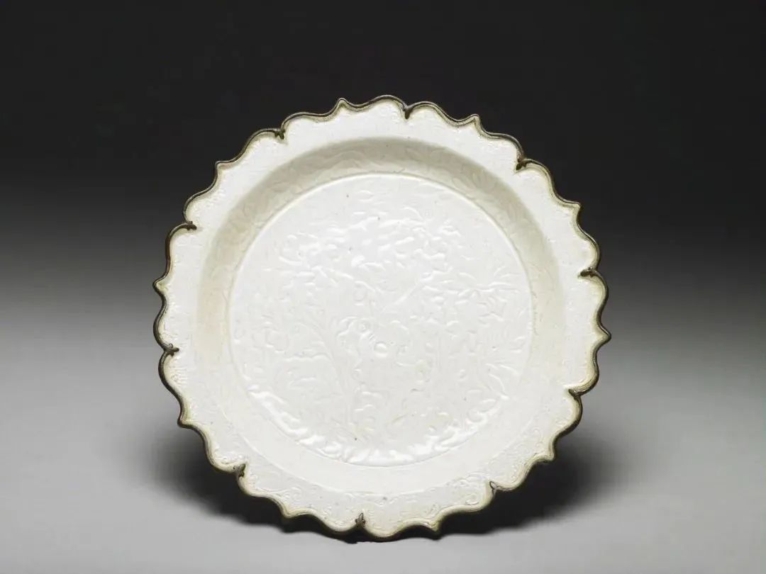 ▲宋 定窑白釉刻花里蟠螭外莲瓣纹盘
