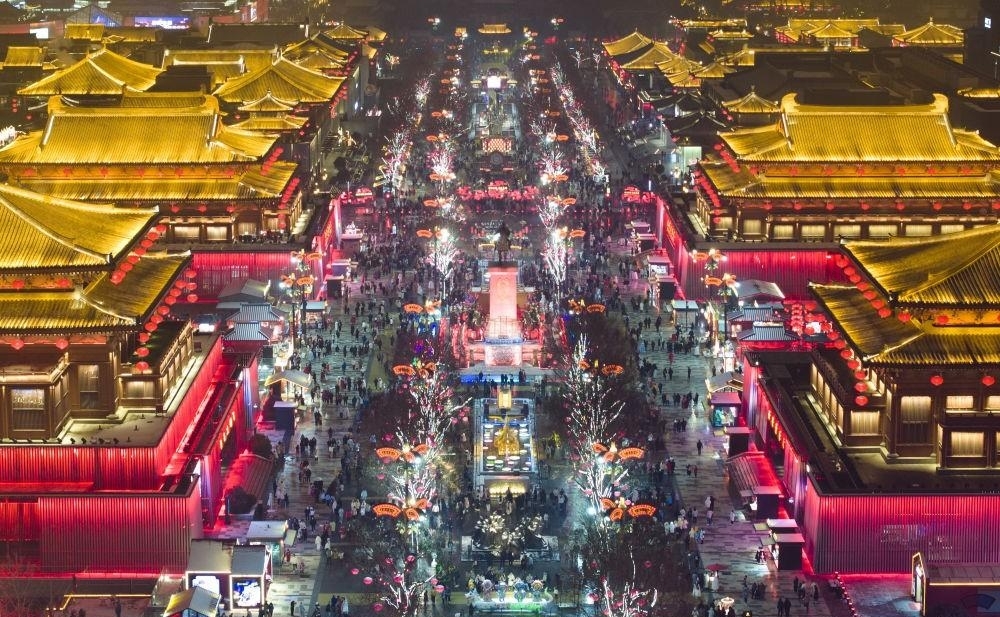 这是2024年2月2日拍摄的西安大唐不夜城景色(无人机照片)。新华社记者 邵瑞 摄