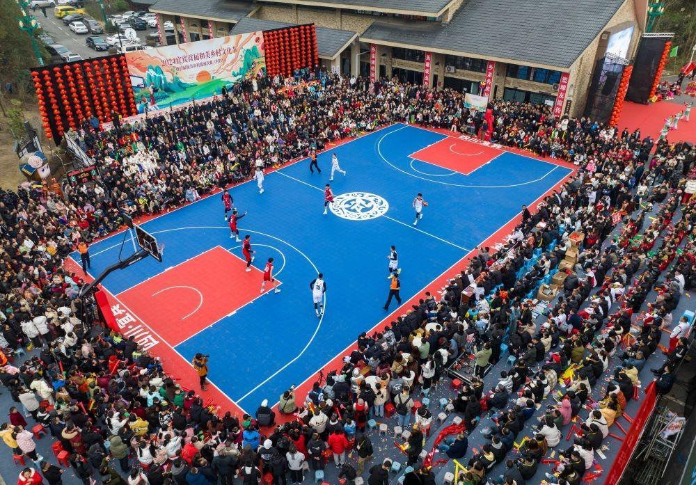 2024年1月29日,村民、游客在现场观赛(无人机照片)。当日,在四川省宜宾市珙县巡场镇三合村,2024宜宾首届和美乡村文化节暨首届和美乡村篮球决赛(村BA)举行,同时,现场还举行了非遗年货购物节、消费券发放等活动,以赛事经济激发乡村活力。新华社发(庄歌尔摄)