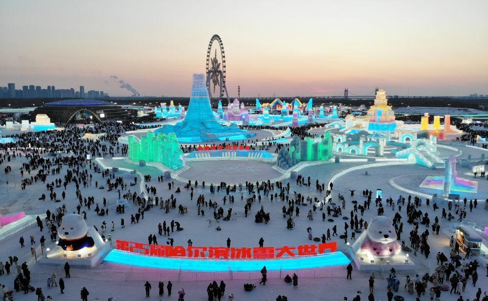 2024年2月15日,游客在哈尔滨冰雪大世界园区内游玩(无人机照片)。新华社记者 王建威 摄