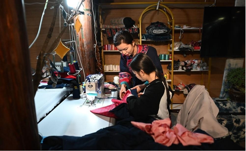 李利(后)在贵州省兴义市万峰林景区门店内与员工一起制作民族服饰(2024年2月19日摄)。新华社记者 刘续 摄