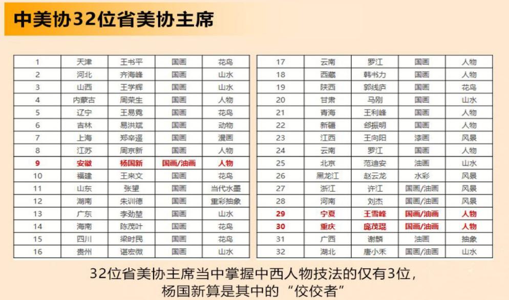 中国美协理事220人,中国油画学会理事203人,中国美术界双理事的画家仅仅2位,而杨国新是唯一的双理事、省美协主席,是画坛独一无二、当之无愧的全能型书画大家。