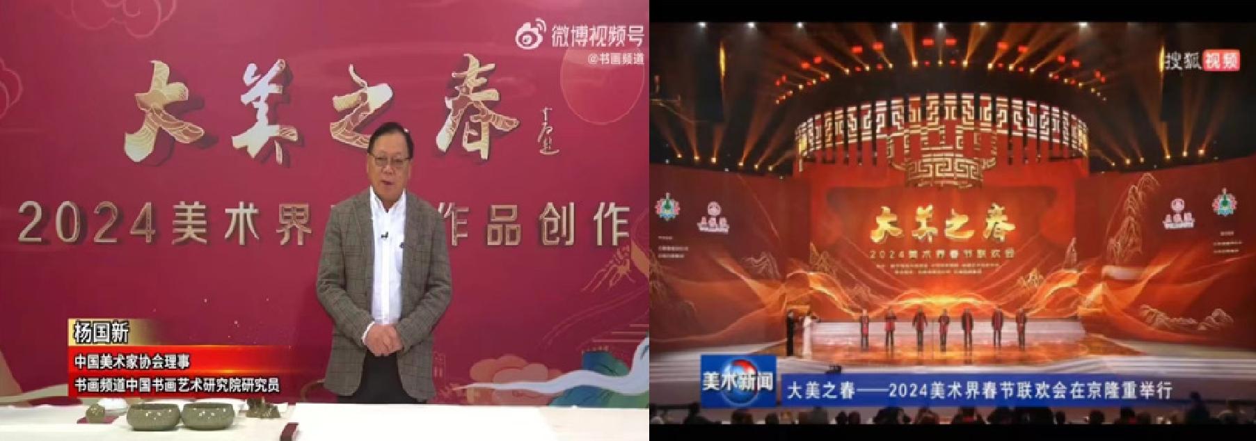 “大美之春”2024年美术界春节联欢会在北京隆重举行,由书画频道、中国国家画院、中国艺术档案学会共同主办,受邀春晚的艺术大家有:杨国新、杨晓阳、吴为山、徐里、范迪安、卢禹舜等艺术家出席了晚会,为2024年的“大美之春“送上了诚挚的祝福,让艺术事业的蓬勃发展更加璀璨夺目!