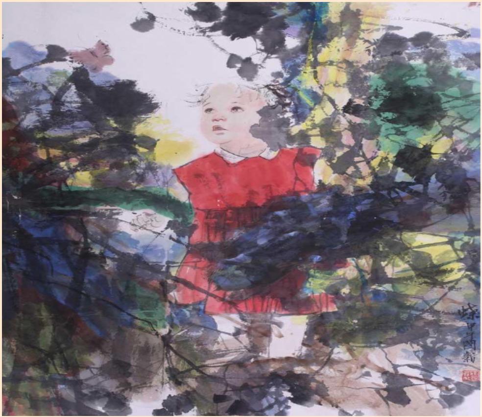将西方表现主义的方式融合在传统人物画中,以泼彩和泼墨的方式构置前景使具象和抽象相融合,色彩鲜艳、墨色润泽形成了墨彩交融和谐画面,打破了中国传统人物画白描、写意、重彩的格局形成了新的独有风格,自成一派。