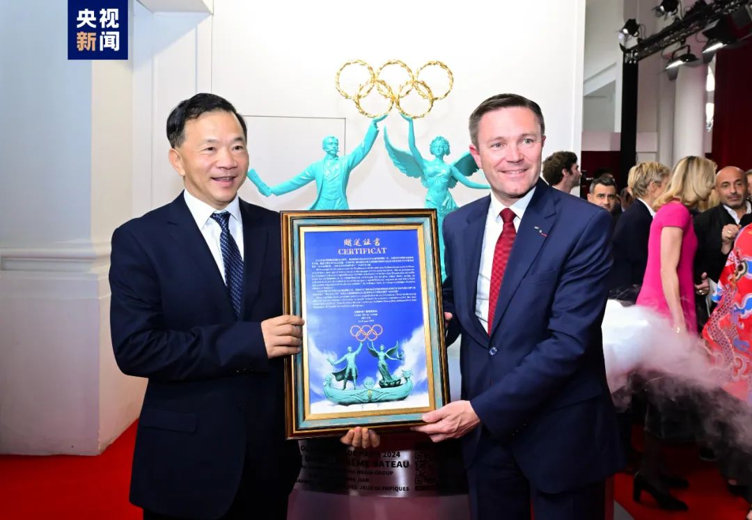 △中宣部副部长、中央广播电视总台台长慎海雄向法国国家奥林匹克和体育委员会主席拉帕蒂恩颁授中国雕塑家黄剑的雕塑作品《同舟共渡》赠予证书