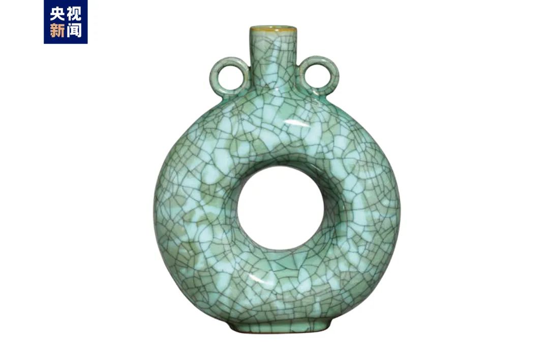《哥弟混合三环瓶》是两种不同泥巴的有机结合。它的奇妙之处在于突破了哥、弟窑历来不能混合制作的表现技法,把哥窑泥与弟窑泥有机地结合在一起,经过1310度的高温烧制,让哥窑开了大片,弟窑开成碎片,如迷彩般意想不到的融合。瓶身线条流畅,造型优雅,釉色温润如玉,展现出一种和谐共生的美感。