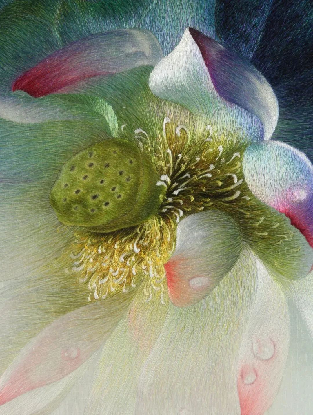荷上的露珠更是作品的亮点,作者匠心独具的用针脚起落结合光影效果,打造出晶莹剔透,清澈欲滴的露珠,展示了中国非遗匠心的精妙,中西文化艺术融合的美好,也传递了真诚的友谊和祝福。