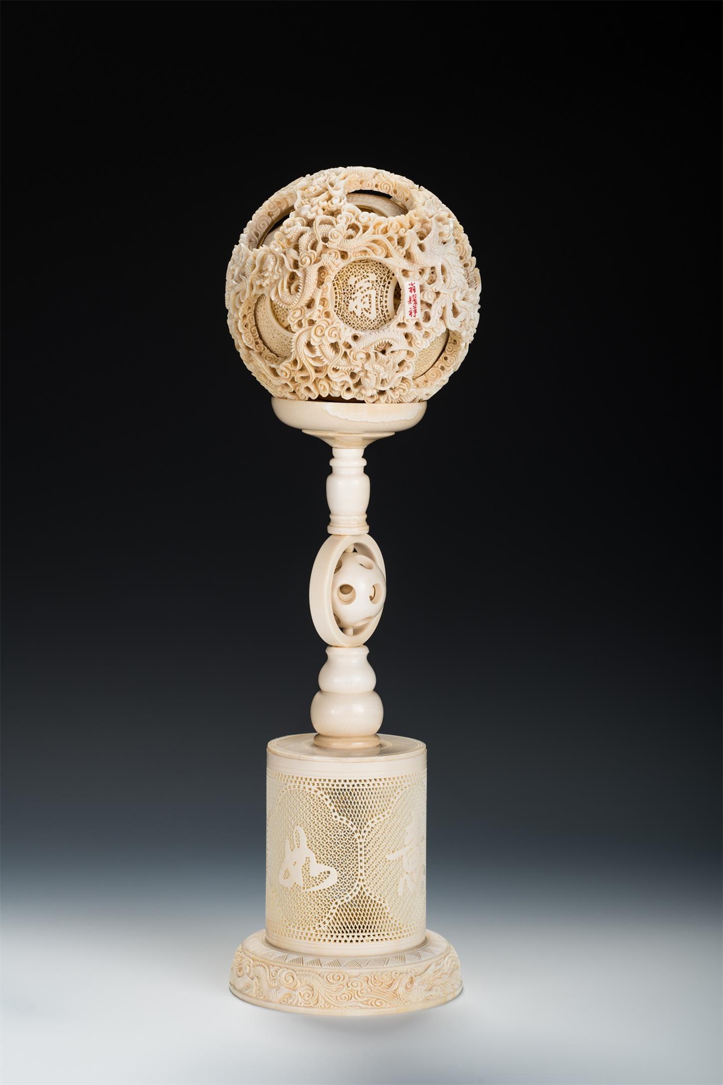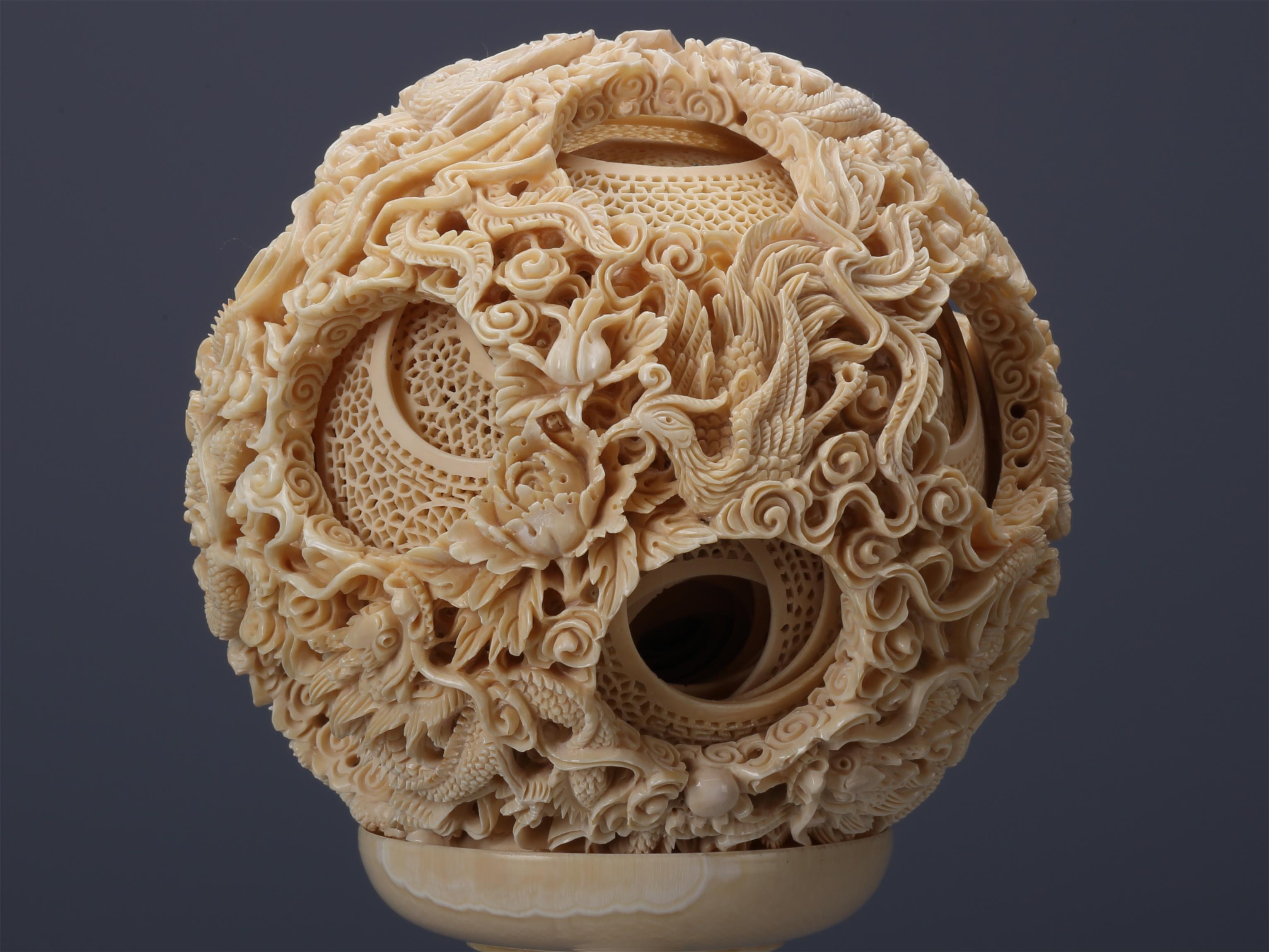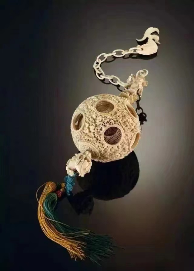 象牙球源于宋代,据史书记载,“直通一窍,内车二重,皆可转动”,亦称“鬼功球”、“仙功球”。球内卓有吉祥图案,球外雕有如意、福寿、牡丹花纹,外观显得十分晶莹华丽。自古帝王权贵都把象牙球视为富贵荣华吉祥物收藏于厅堂欣赏。