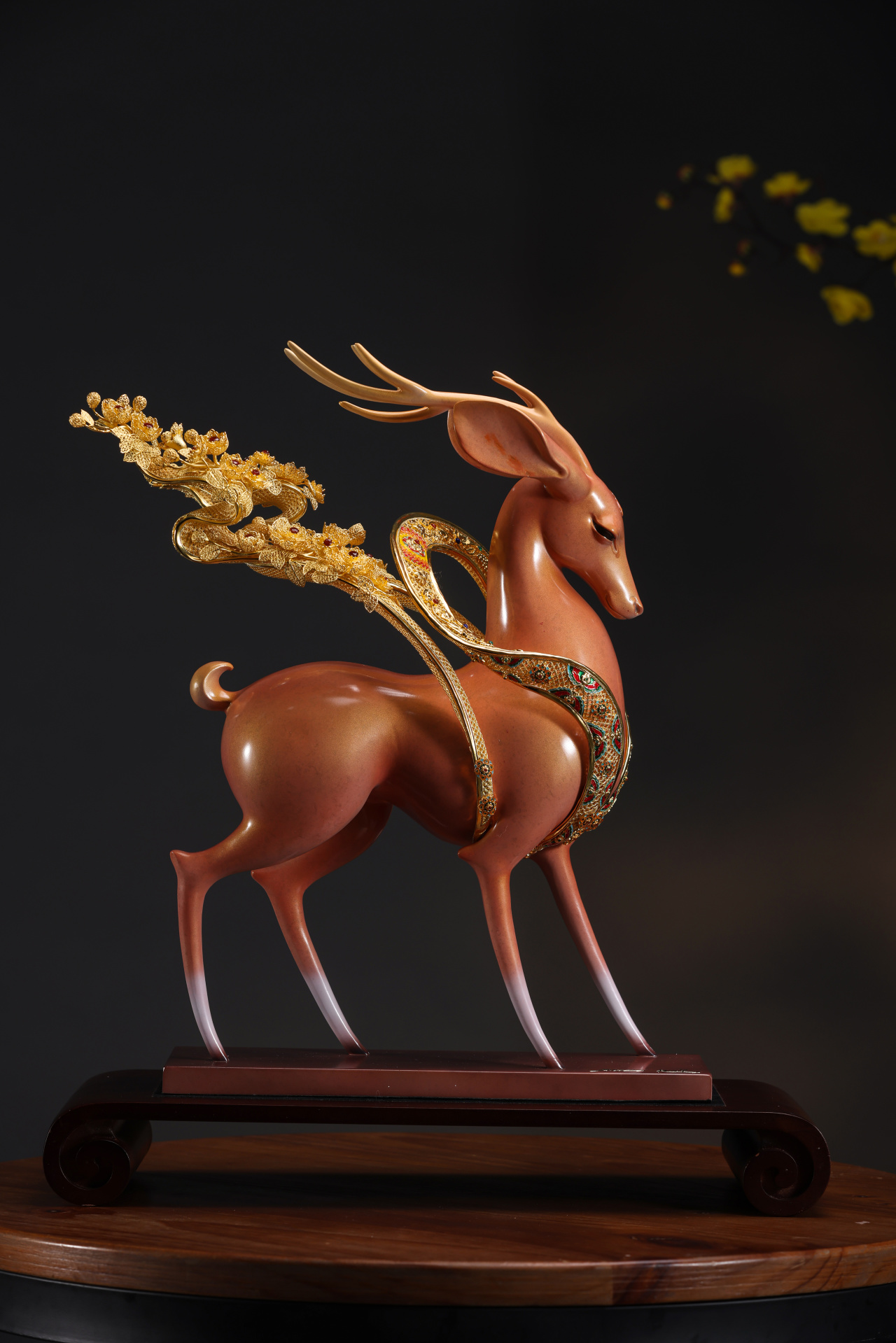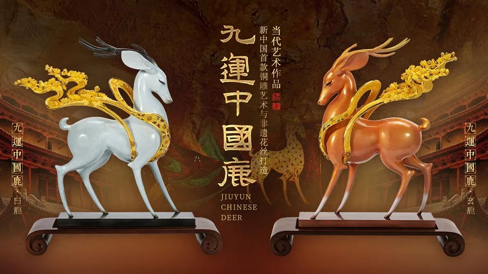 作品以敦煌壁画艺术之大成《鹿王本生图》为创作原型,以当代雕塑艺术结合四千年花丝镶嵌、五千年铜雕艺术,打造新中国首款铜雕艺术融合非遗花丝的当代艺术珍品。
