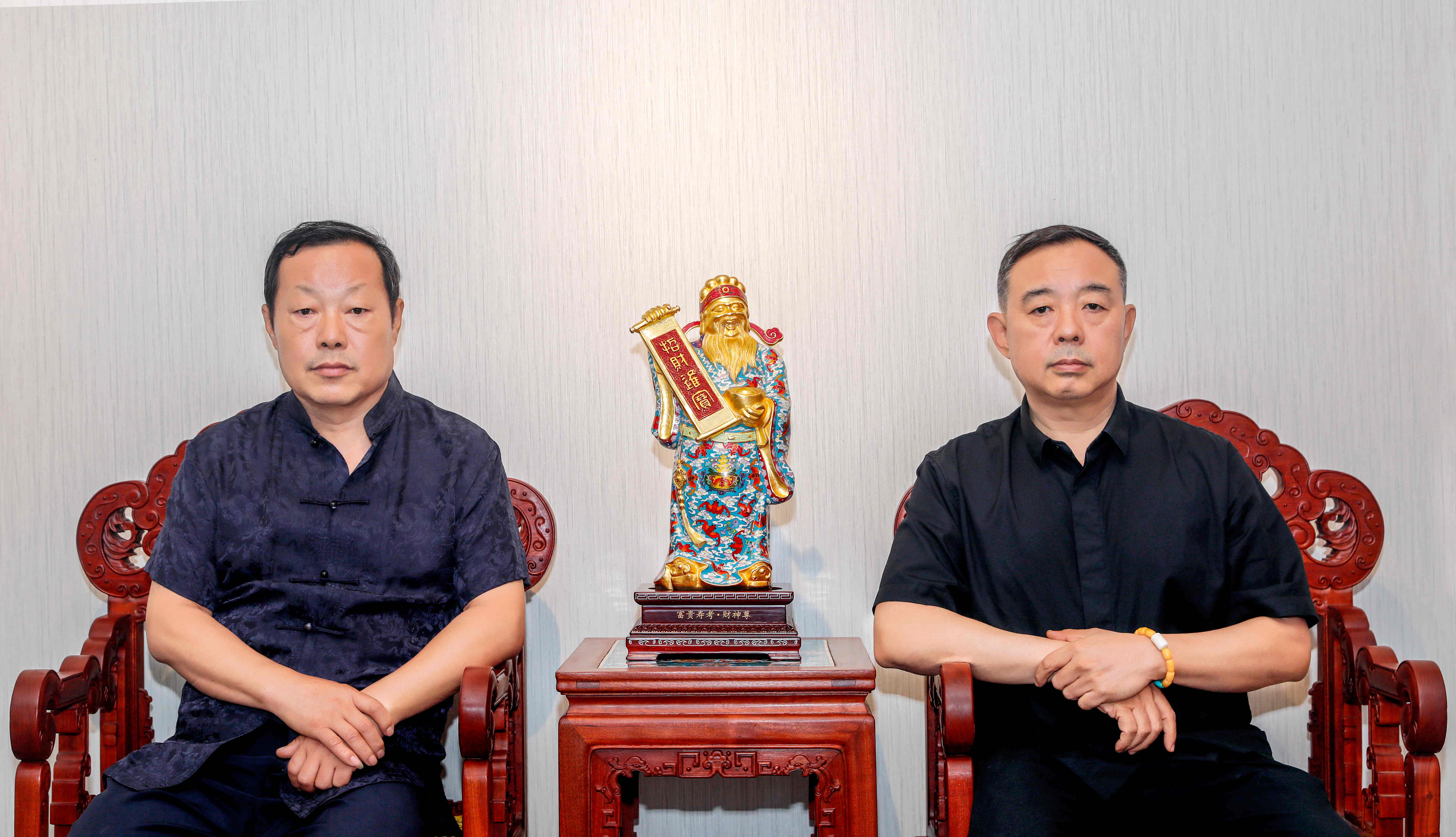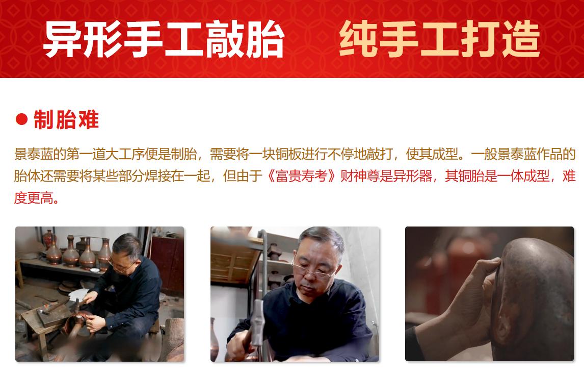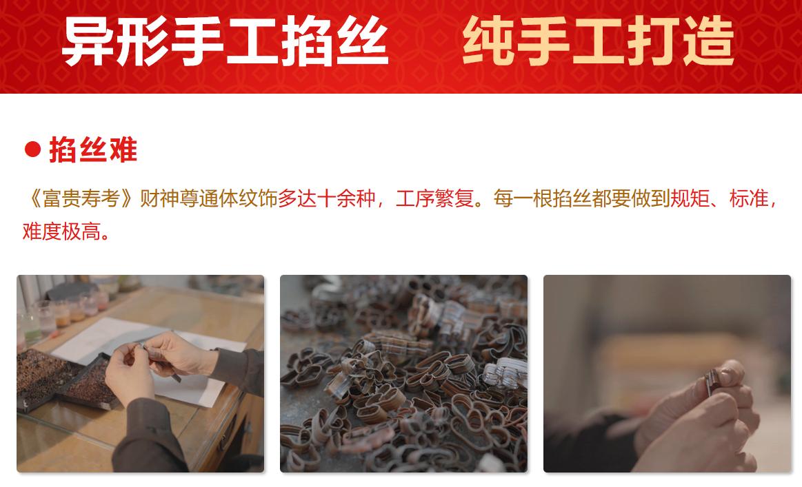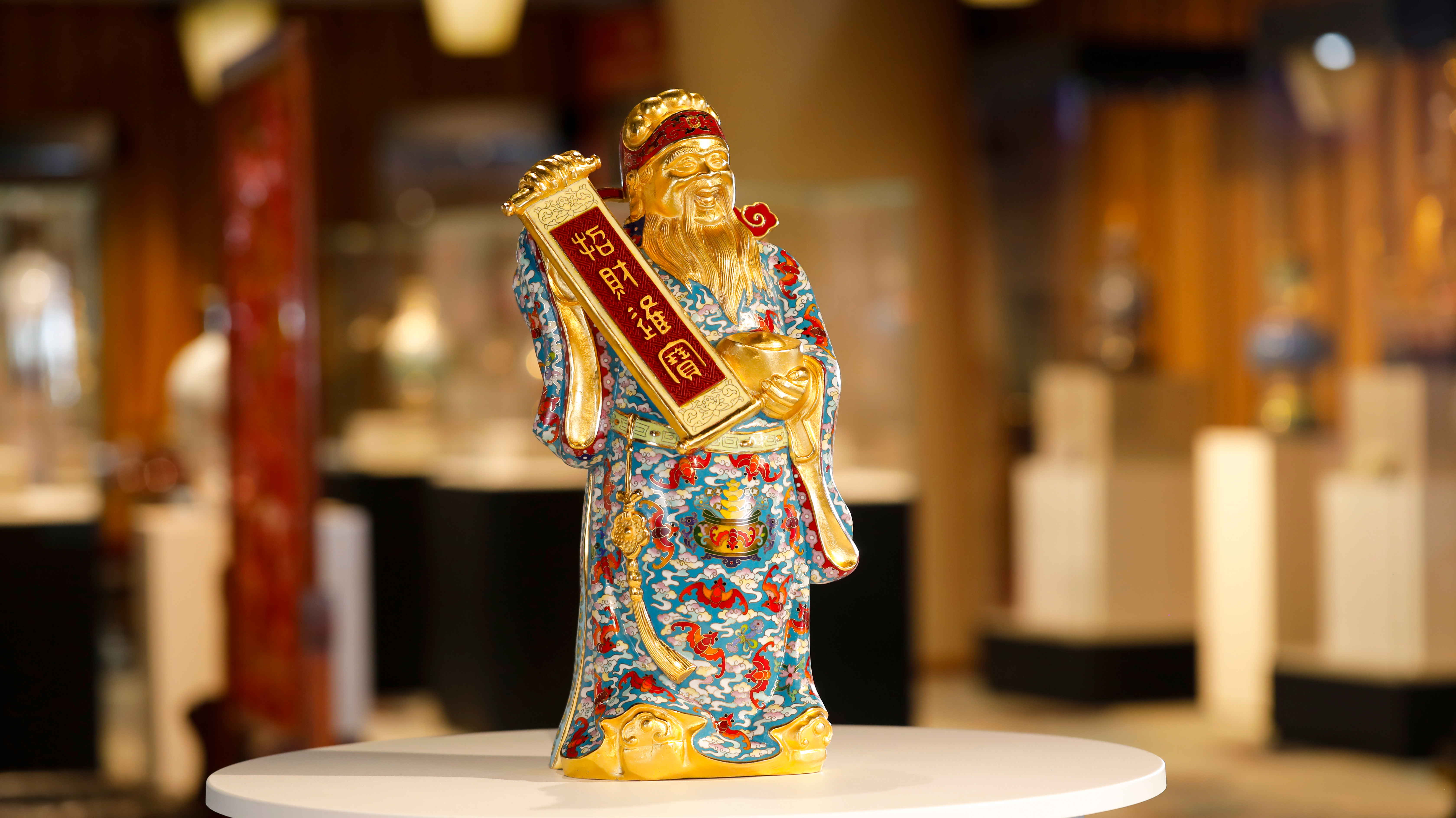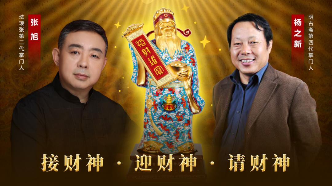 “珐琅张”传承人张旭与明古斋第四代传承人杨之新,以财神为题,设计创作《富贵寿考》财神尊,不仅代表了两位大师级人物对传统文化的深刻理解和创新诠释,更在珐琅与漆艺的交融中开创了先河,成为3500年珐琅史,8000漆史上第一尊财神尊,填补了空缺。