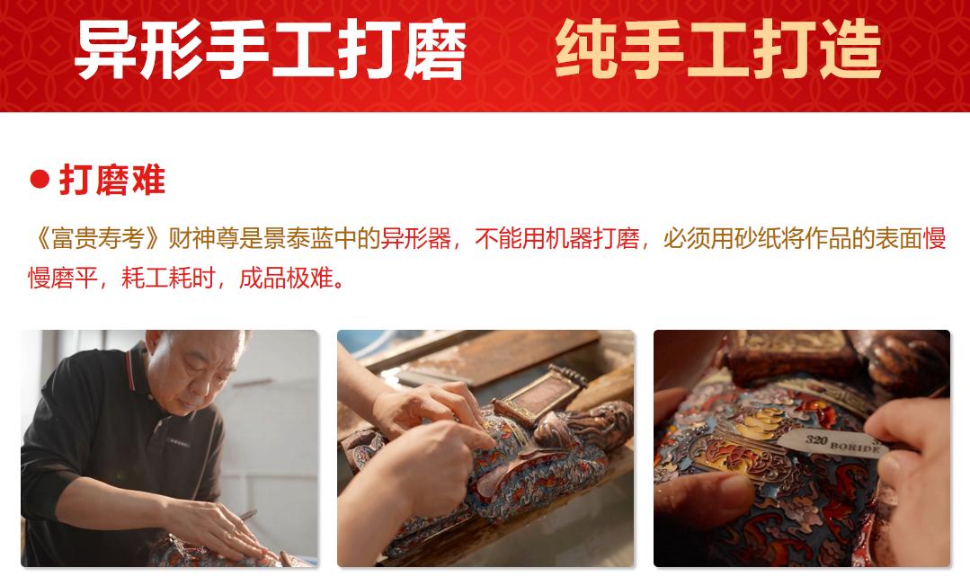 “珐琅张”传承人张旭与明古斋第四代传承人杨之新携手合作的《富贵寿考》财神尊,不仅是对中华民族传统财神信仰的艺术再现,更是珐琅工艺与漆器艺术融合创新的里程碑之作。此尊高约43厘米,作为景泰蓝中的异形器,作品工艺之难、成本之高、耗时之长超乎想象。