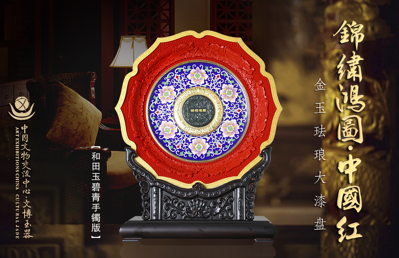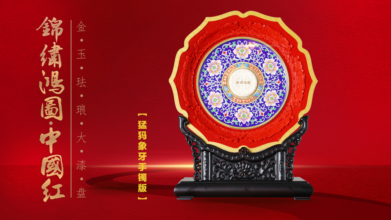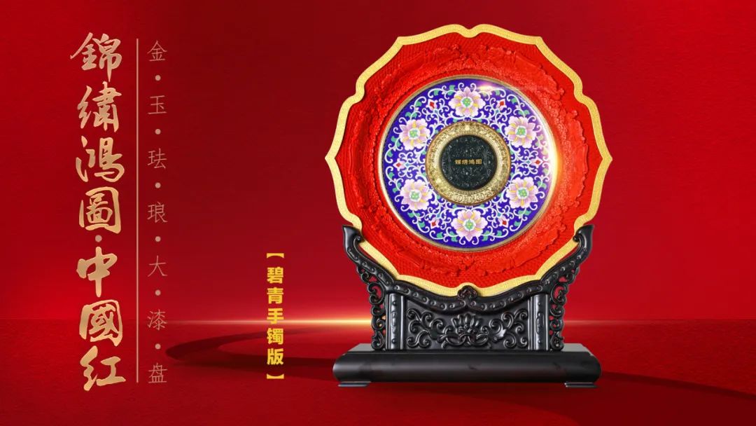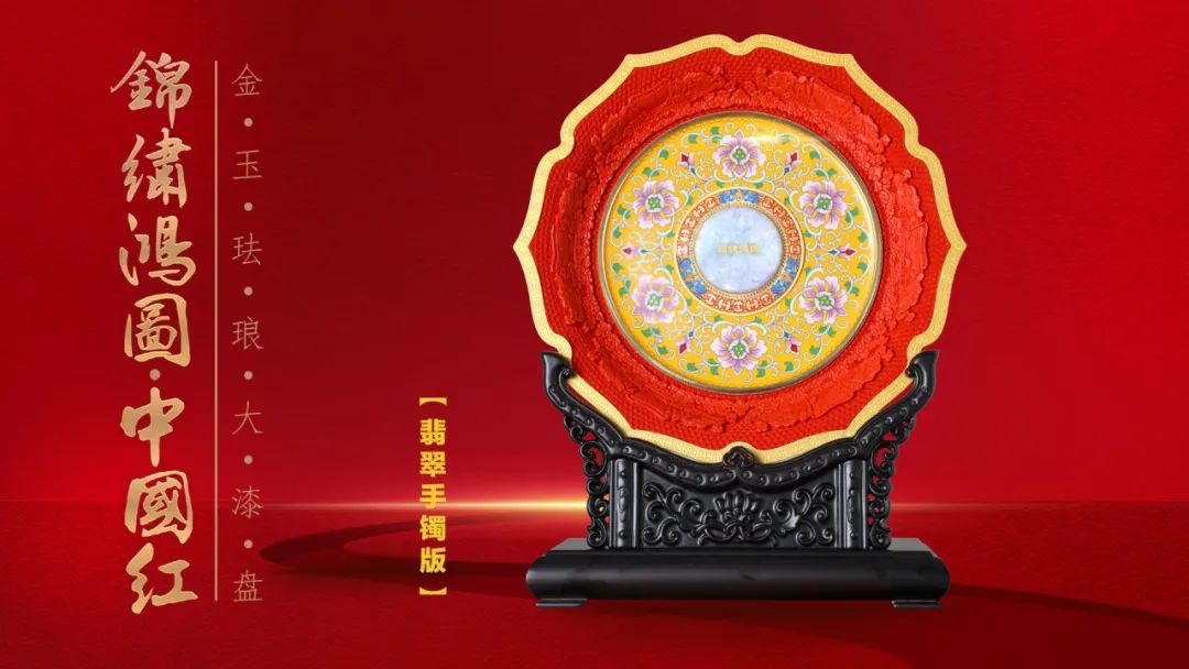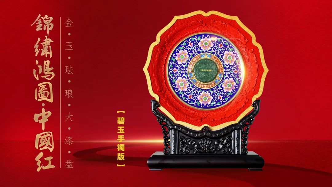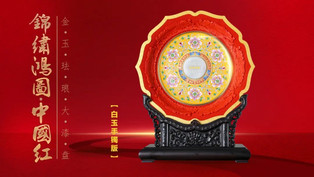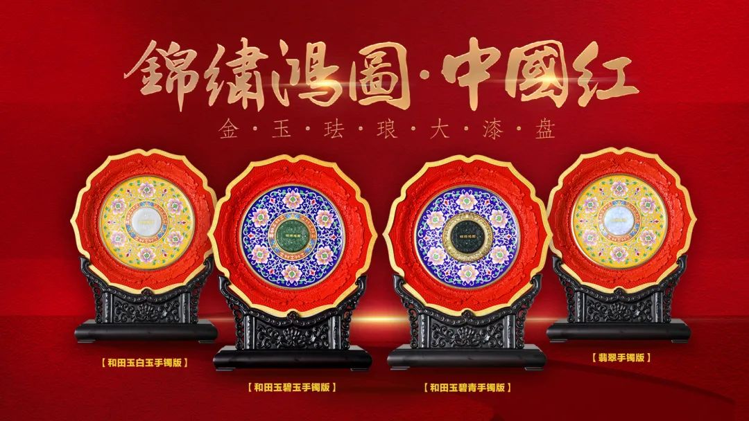 《锦绣鸿图·中国红》金玉珐琅大漆盘,以“国玉”和田玉,代表华夏民族更古不变的人文精神,“国粹”景泰蓝,代表着多元文化的包容与创新,“国漆”大漆,代表中国人勇敢、热情等敢于拼搏的精神。以“金玉满堂”(玉雕)、“国色生辉”(大漆)、“富贵繁荣”(景泰蓝)的非遗技艺,展现大国盛世气象,成为2024甲辰龙年、与新中国75周年华诞的最高礼赞。