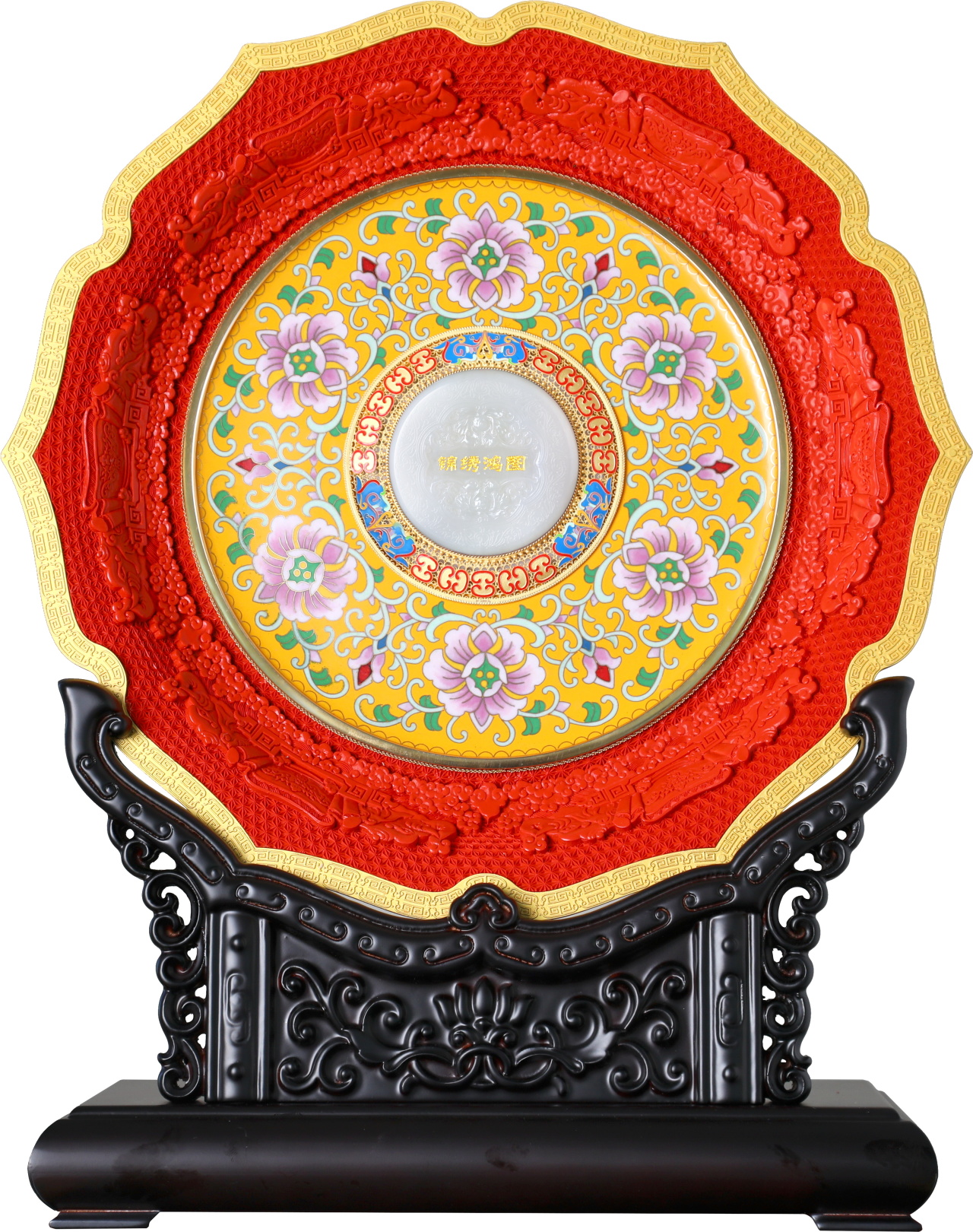 《锦绣鸿图·中国红》整体造型犹如绽放的菱花,双面雕漆为主体,同时将景泰蓝、玉雕完美融入其中,在参考7件国家一级文物经典造型、元素的基础上全新创作。