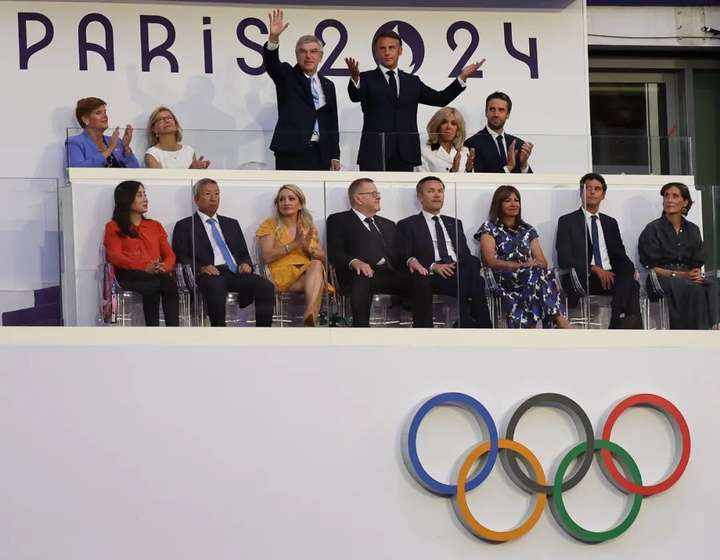 当地时间8月11日,国际奥委会主席巴赫(上排左三)与法国总统马克龙(上排右三)出席闭幕式。新华社记者 曹灿 摄