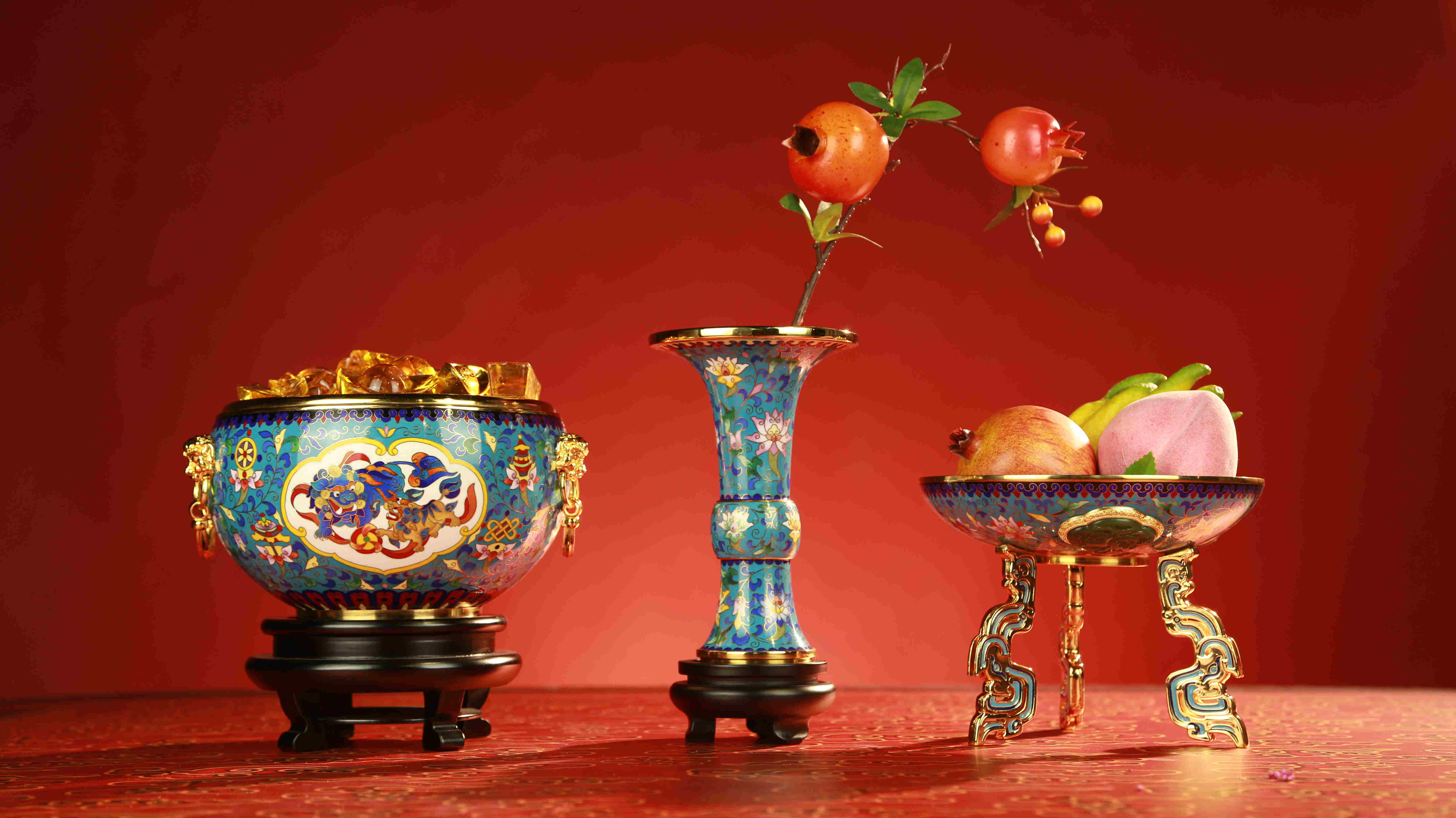 《三宝合尊》以故宫太和殿前大铜缸、颐和园所藏西周粣方鼎以及皇家旧藏的景泰蓝《出戟花卉纹花觚》三件珍贵文物为源再创,同时融合景泰蓝、玉雕、漆雕、金属錾刻四大绝技于一体,反映“和合共生、美美与共”时代主题,具有可合可分、一尊变三、一尊四用的“变身”功能,是让博物馆文物活起来的典范作品,展示出中国工艺美术“新文物”的风采。