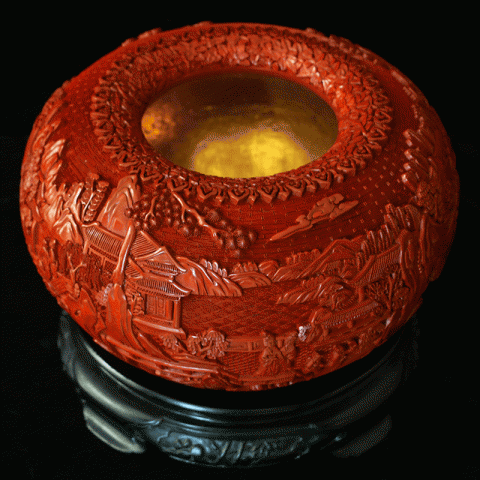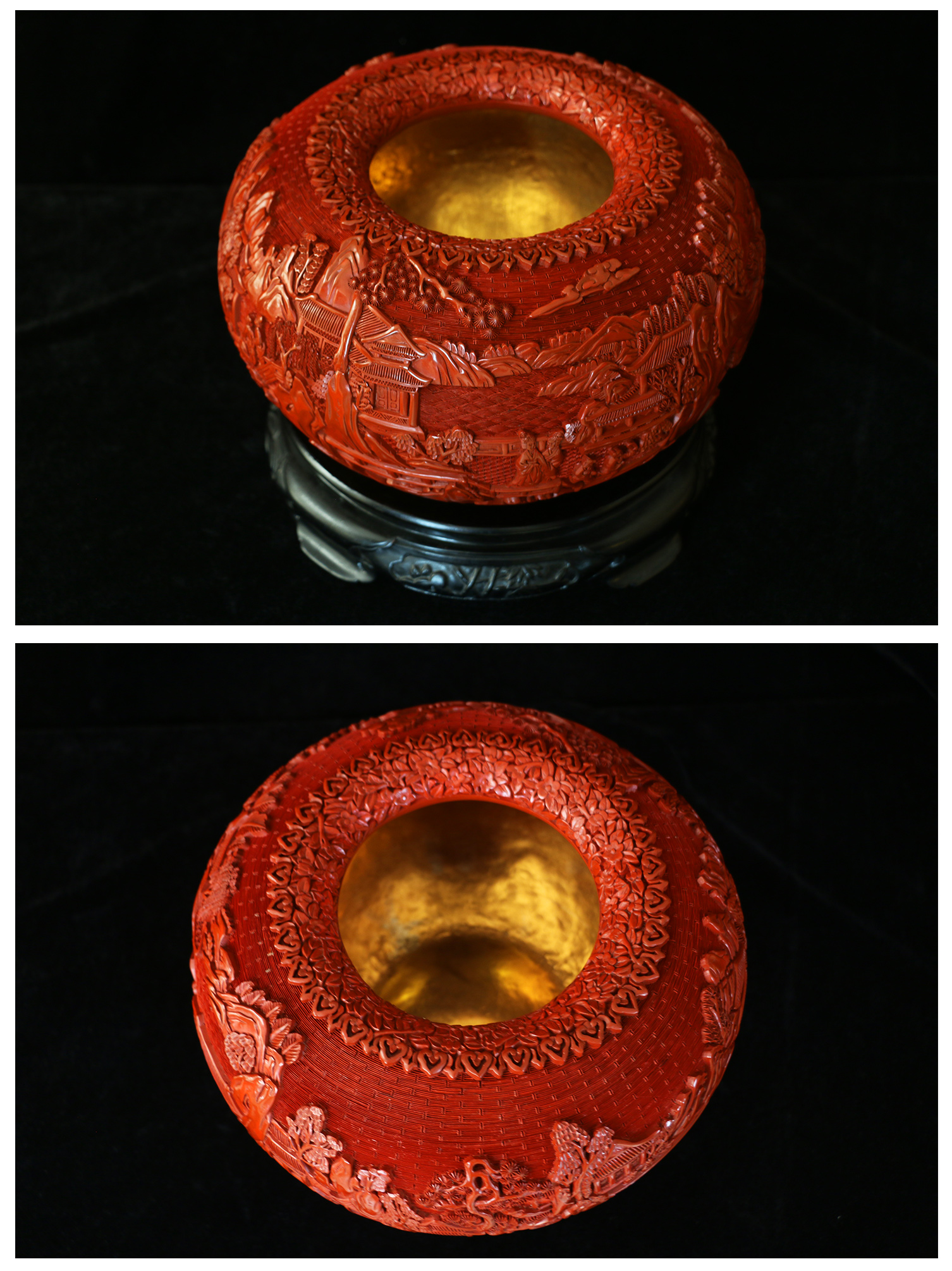 【中藝堂】杨之新 雕漆《山水人物钵缸》